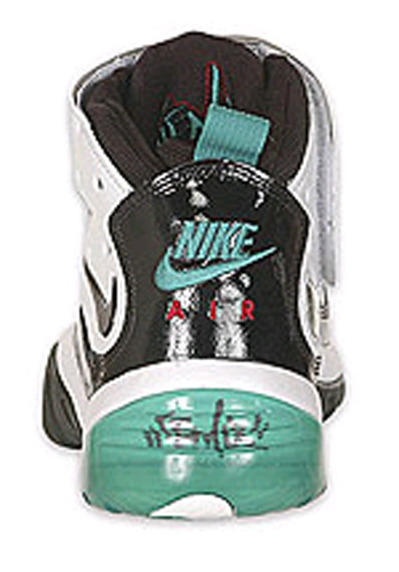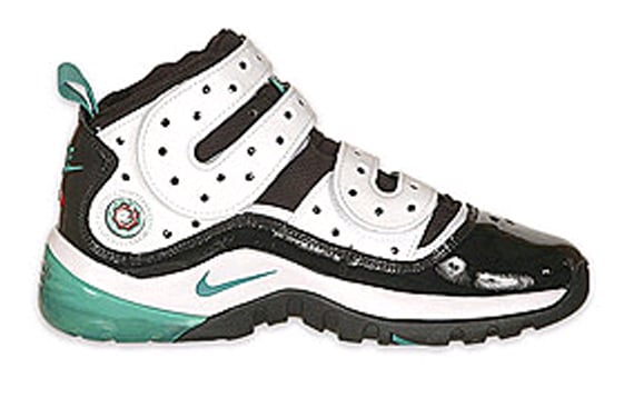 The Nike Zoom Sharkley is releasing in full effect to make its presence in Nike Basketball permanent. The newest Sharkley comes in the black/white/aqua, with a black patent leather toe, white leather upper, black mesh panels, white midsole, and black outsole. The aqua is present on the Nike tongue tag and heel tab. Aqua is also found on the sole’s Nike text and translucent heel of the sole. Nike Air is also stitched on the back heel in aqua and red, along with a couple other details that makes this a sweet shoe. Available now on Finishline.
