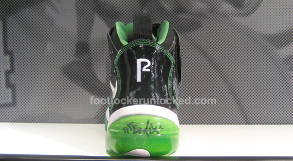 The Nike Zoom Sharkley has been in the news quite a bit as of late due to new GR and PE colorways still hitting retailers and also due to the fact that the Zoom Sharkley was recently added to Nike iD. Yesterday, we showcased the Paul Pierce “Home” Player Exclusive (PE) colorway, and we have the “Away” pair to share today. The “Away” style features the away colors of the Boston Celtics via the black patent leather upper with white and green accents. Similar to the “Home” PE, the the Nike Zoom Sharkley – Paul Pierce Away PE is now available at the House of Hoops as well as two Footlocker locations in Boston: 779 Dudley Street and 375 Washington Street. Via Footlocker.