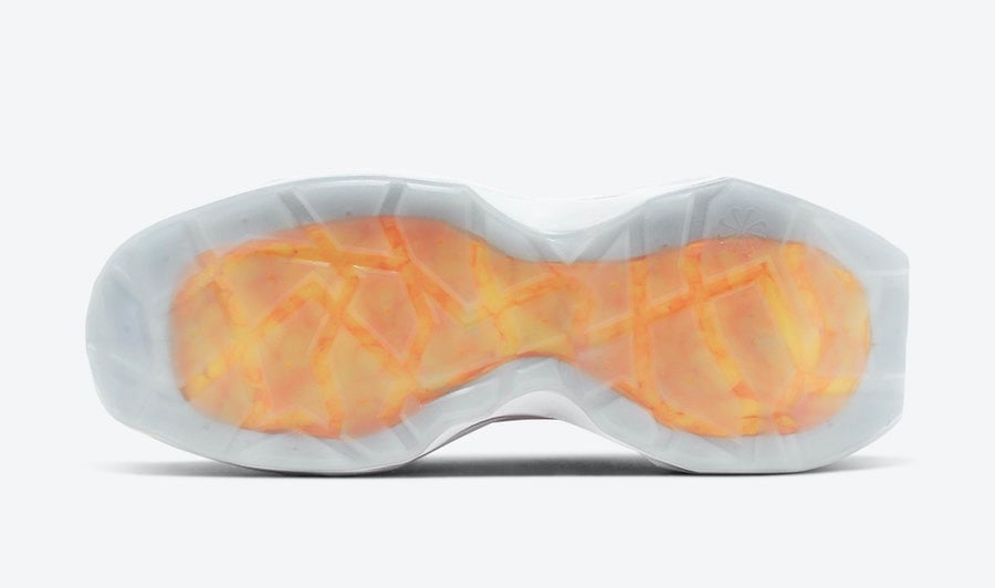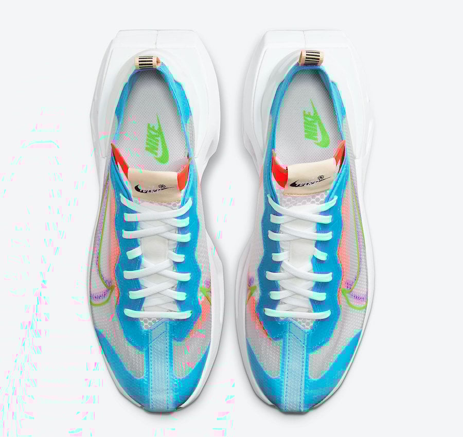 Dressed in a White, Green Strike and Vivid Purple color combination. Highlighted with a transparent upper while shades of Blue, Red, Green and Purple are spread throughout. In addition we have White across the thick midsole while Yellow is peeking through. Finishing the look is a White and Yellow rubber outsole.