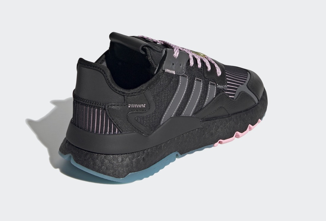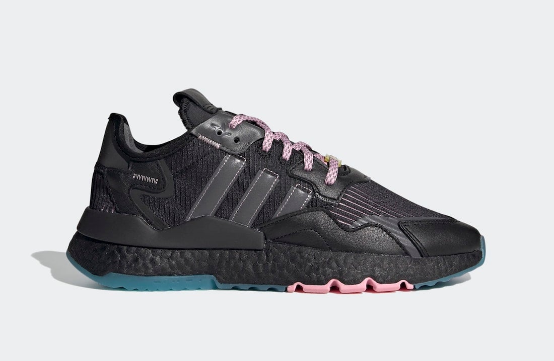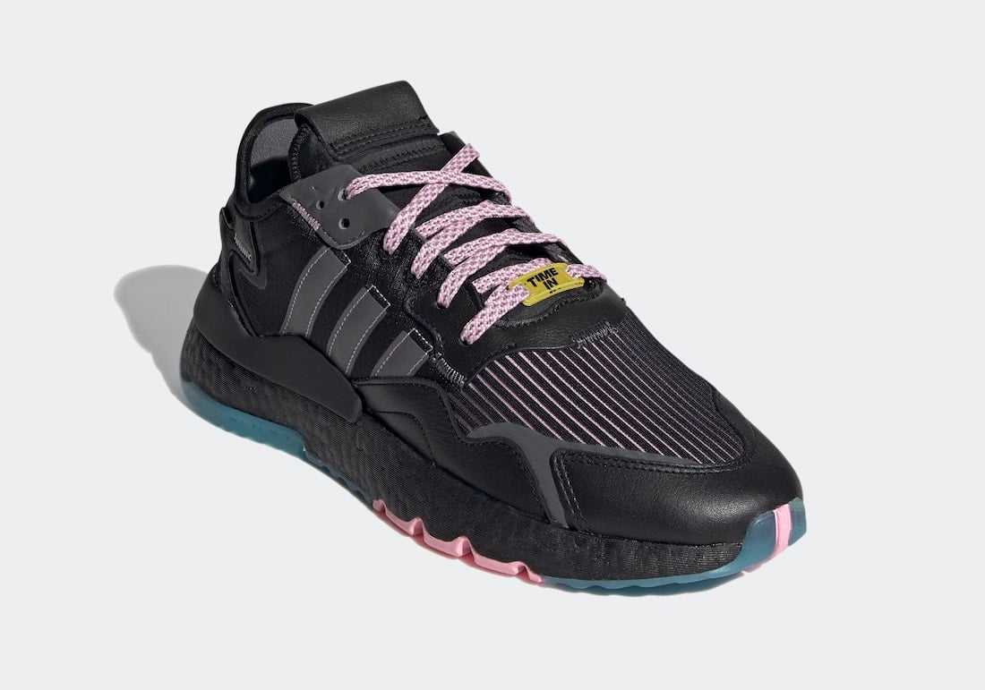 This adidas Nite Jogger by Ninja comes dressed in a Core Black, Grey and Blue Glow color combination. Constructed with a Black mesh upper along with Grey leather on the overlays. Following we have Pink and Blue detailing throughout, โTime Inโ on the lace dubraes while a Black Boost midsole finishes the look.