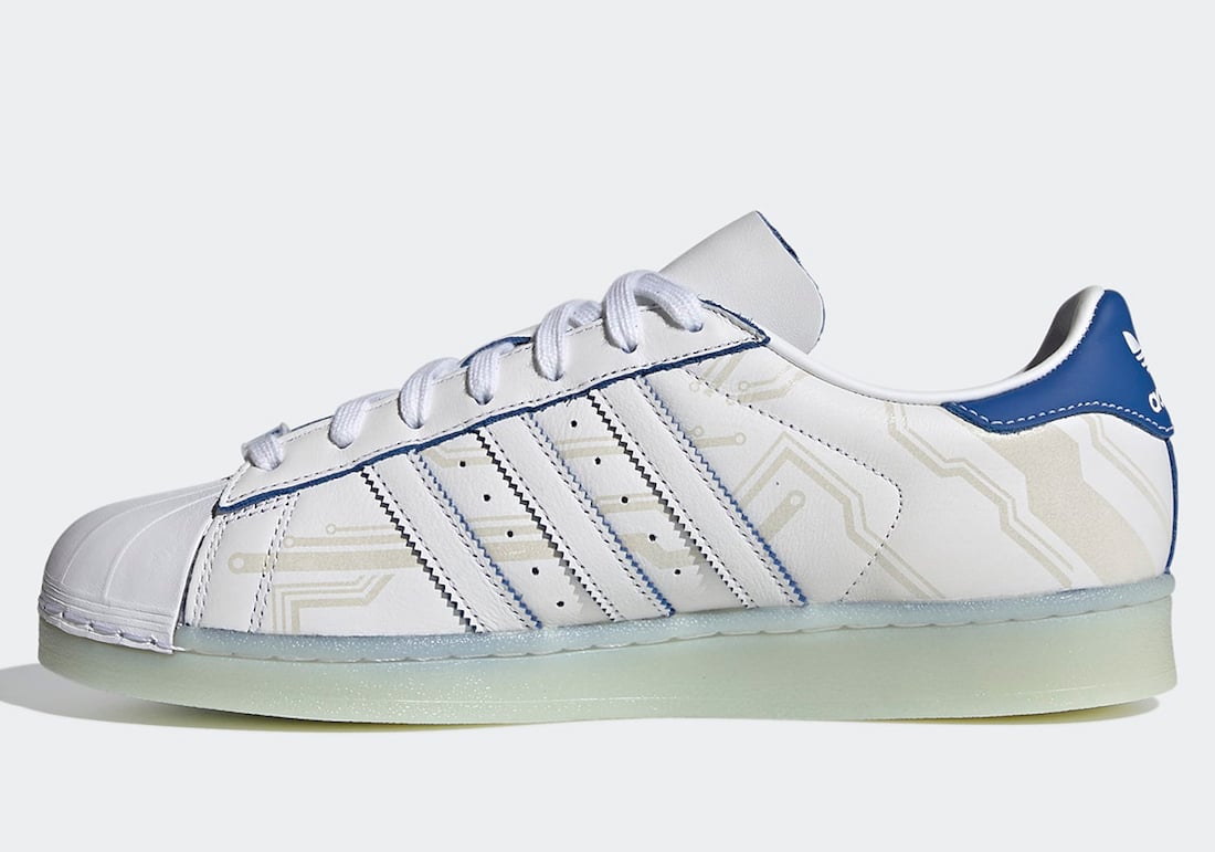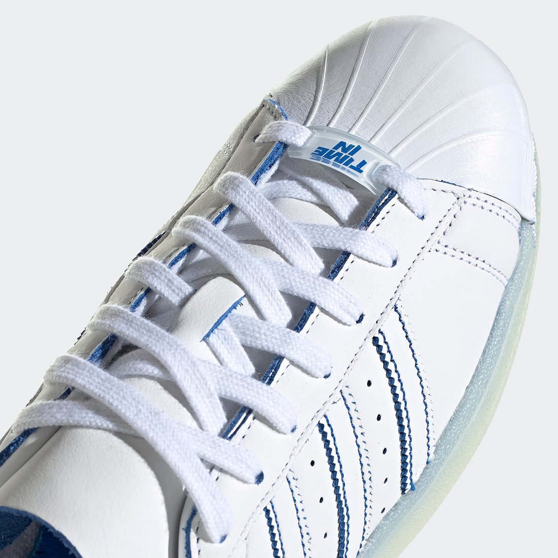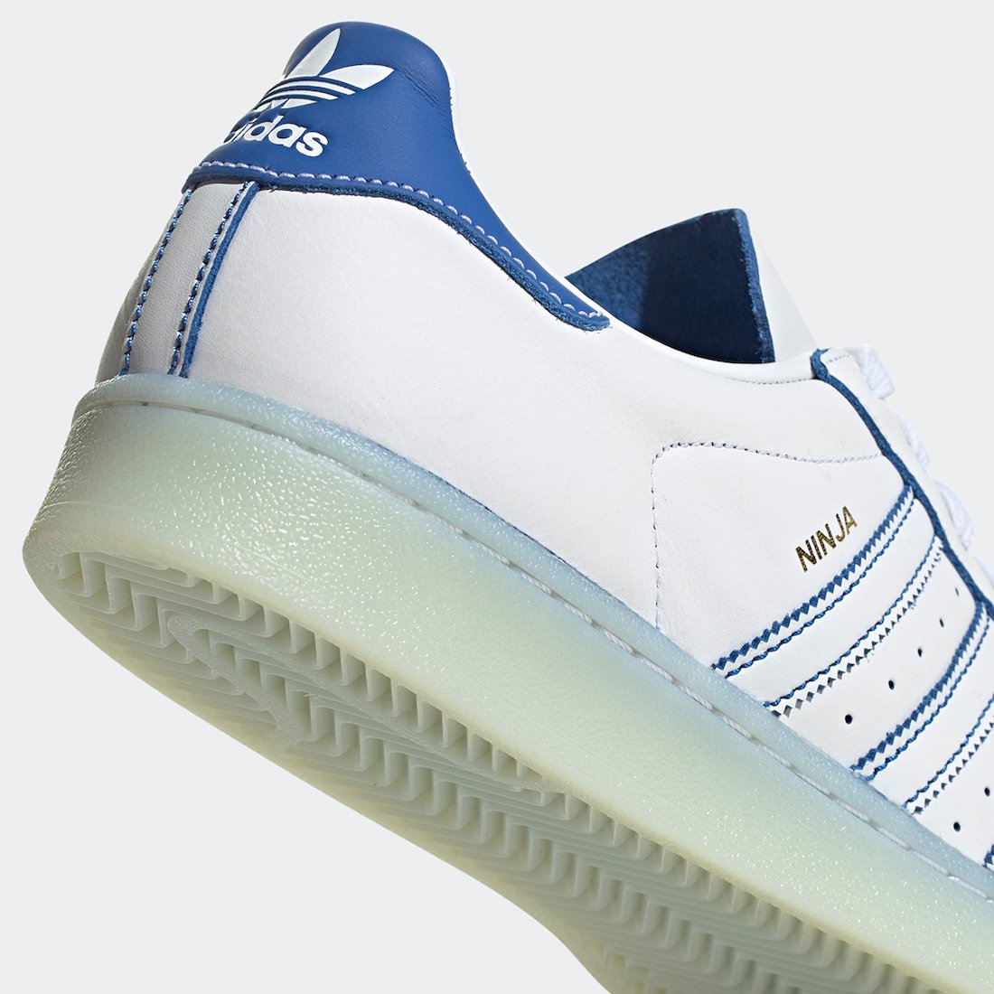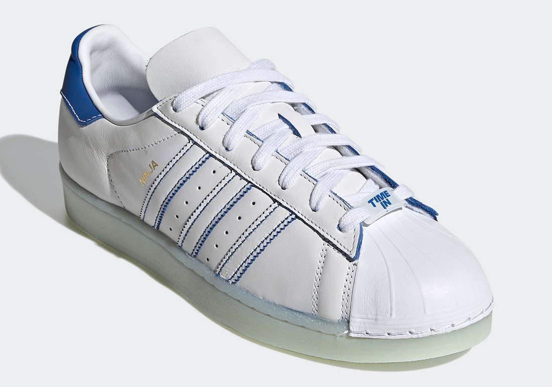 Going over the pair, it features White leather across the upper while Blue lands on the Three Stripes branding and heel tab. Instead of the traditional โSuperstarโ branding, its replaced with โNinjaโ. This pair also comes with his signature โTime Inโ on the lacing dubrae.