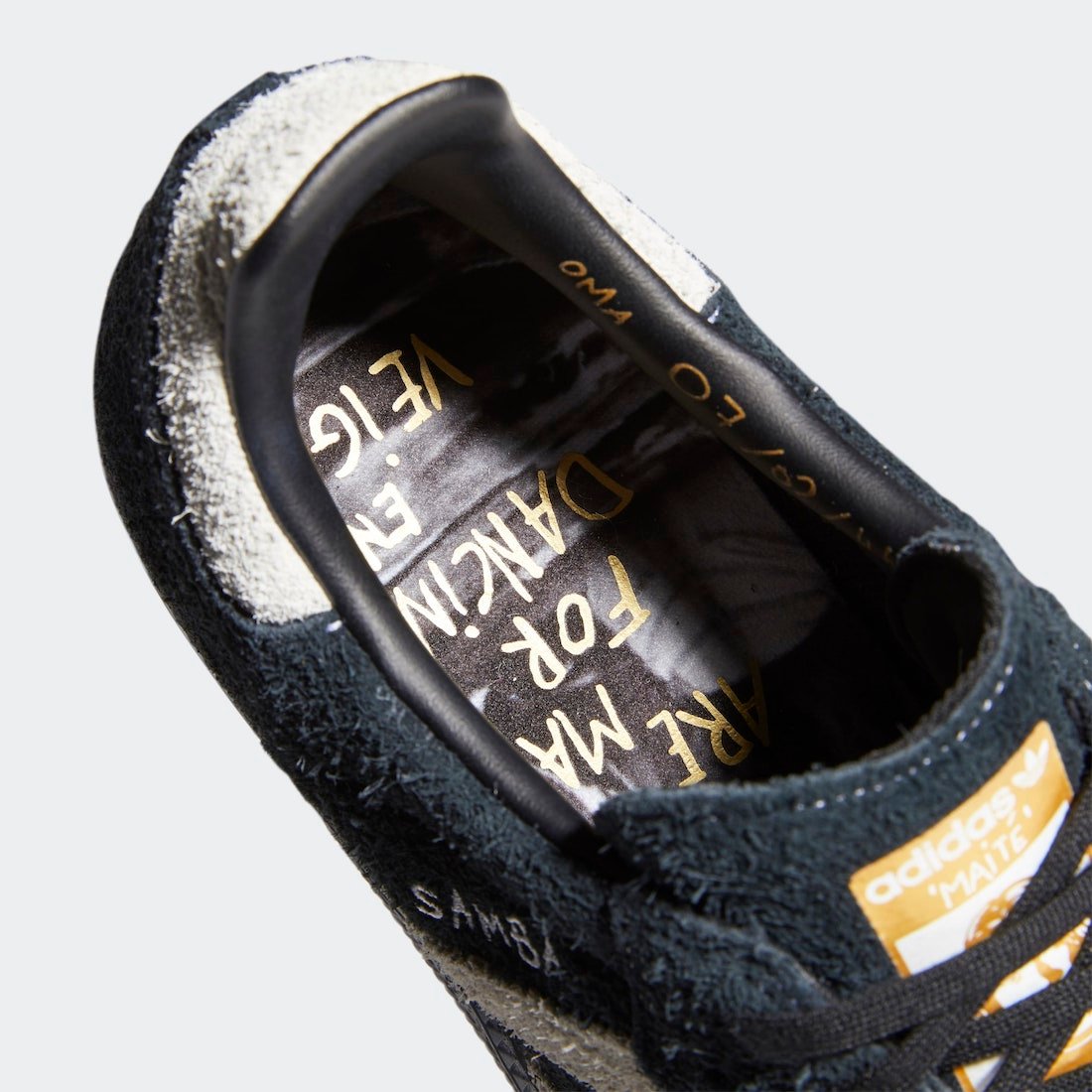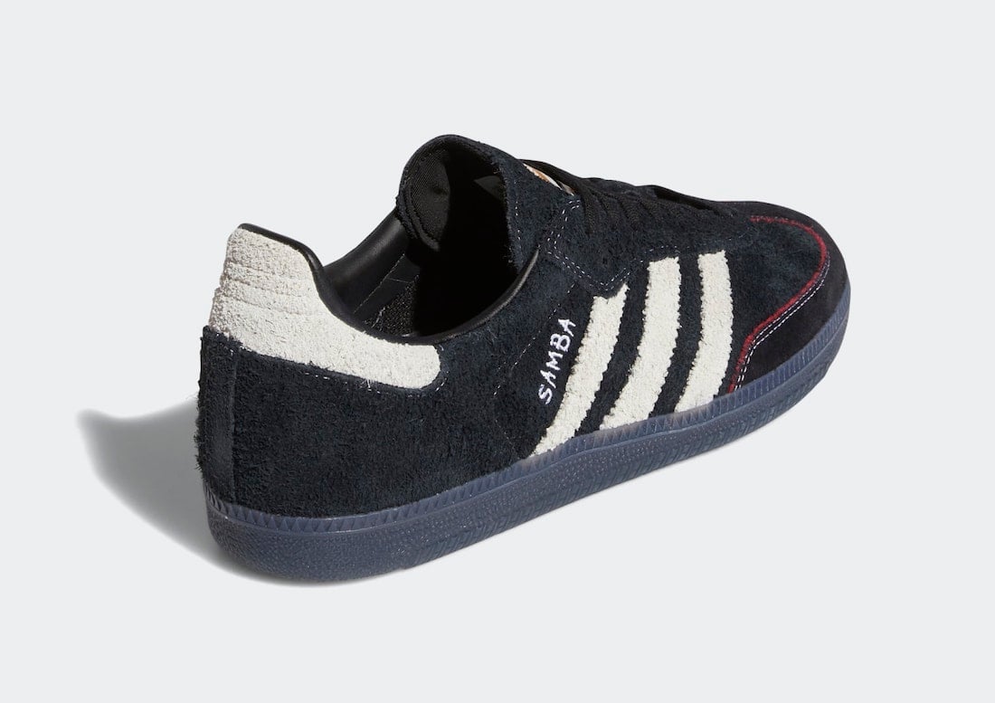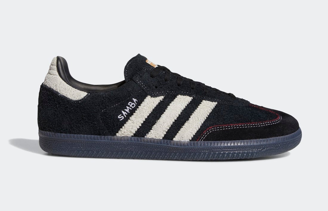 The adidas Samba, updated for the first time for skateboarding by Maitรฉ Steenhoudt. Capturing the classic elements of the original Samba, Steenhoudt’s design features a black suede upper with white leather stripes. Wanting the shoe to look better with wear, Steenhoudt added a hidden layer under the t-toe that reveals color as you wear it down. A handwritten “Samba” and original artwork on the sockliner add a personal touch to the iconic look.