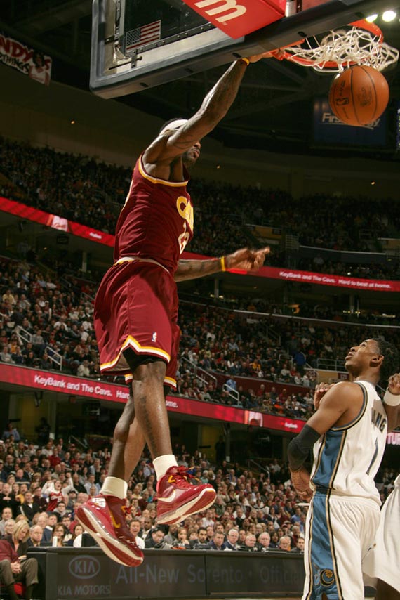 As the Cavs took out the trash with the Washington Wizards, they did it in style with their red Hardwood Classic throwback jerseys. To match the throwback uniform, LeBron bust out the matching HWC Nike Air Max LeBron VII (7) for all our “oohs” and “aahs.” The red base patent leather shoe features yellow and white accents throughout the shoe to match the uniform to the very last detail. It seems like everytime LBJ rocks a new pair of Nikes, his team comes out with a win. Stay tuned to see more of LBJ and the Cavs, as well as what’s on their feet.