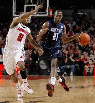 There weren’t too many top 25 NCAA men’s basketball teams in action last night. Moreover, although whenever the University of Connecticut’s men’s basketball team is discussed it is usually in light of a top 25 ranking, the team dropped out of the rankings in which last week it found itself at 19. So last night the men attempted to get back on track against a Big East rival in Louisville…. with the help of the Air Jordan XI and XII. Kemba Walker laced up the Air Jordan XI “Space Jams” we recently spotted Lil’ Wayne rocking at the Grammys. Meanwhile, teammates Stanley Robinson and Jerome Dyson were seen sporting the Air Jordan XII “Flu Game” and Air Jordan XII white/black-varsity red, respectively. Although UConn fell short against Louisville, it sure was a nice treat watching these speedy collegiate athletes running back and forth in such Air Jordan heat. So check out all the pictures after the jump, and let us know who you think was best suited yesterday for the Big East matchup.