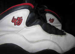 This particular pair has been said to have been worn by the man himself during his comeback after taking a short break from the NBA , which most of you may remember as if were yesterday. Donning the #45 on the ankle and featuring its original non-checkered lining, these are quite possibly one of the rarest AJ10โs in this colorway. If you look closely you can also see that this pair is missing the bungee styled straps on the tongue, pretty interesting if you ask meโฆ Iโd like to know why MJ didnโt have them featured as they helped keep the foot securely in place.