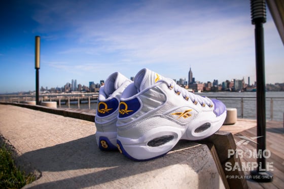 Done up in white leather uppers, Kobe’s PE dons purple and yellow accents with “8” heel branding whereas LeBron’s Reebok Question Mid works in a suede toebox with”LBJ23″embroidery plusย “2” and “3” branding to represent his jersey number. Impressive, right?