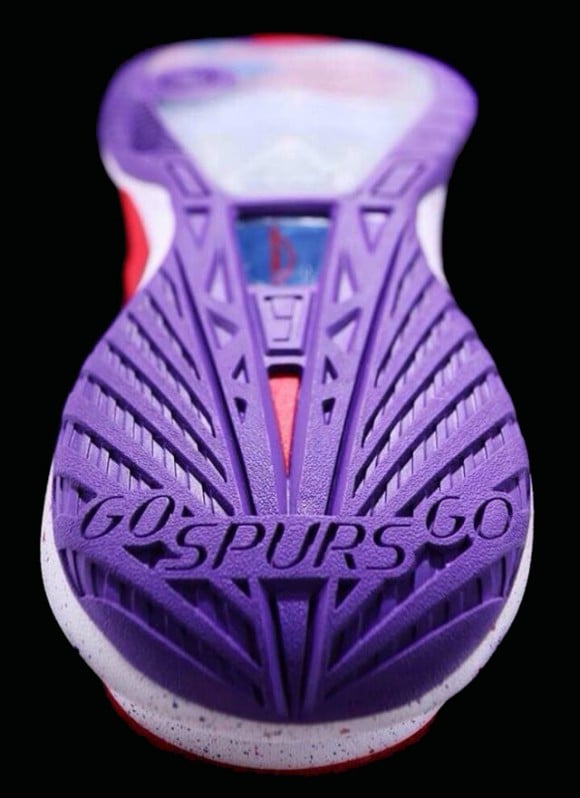 At the end of January, we saw the first images of the PEAK Tony Parker “All-Star” shoes, and now it’s game time! With the NBA All Star Game coming up this weekend, we’re getting some more close ups of this new release. The PEAK Tony Carter “All-Star” come in a all red upper, or purple/silver combo, with an intricate graphic print on top. Branding is red, located on the heel. “GO SPURS GO” is engraved on the bottom of the soles, as well for all you fans! We likey. You guys feeling these? (Photos via Project Spurs)
