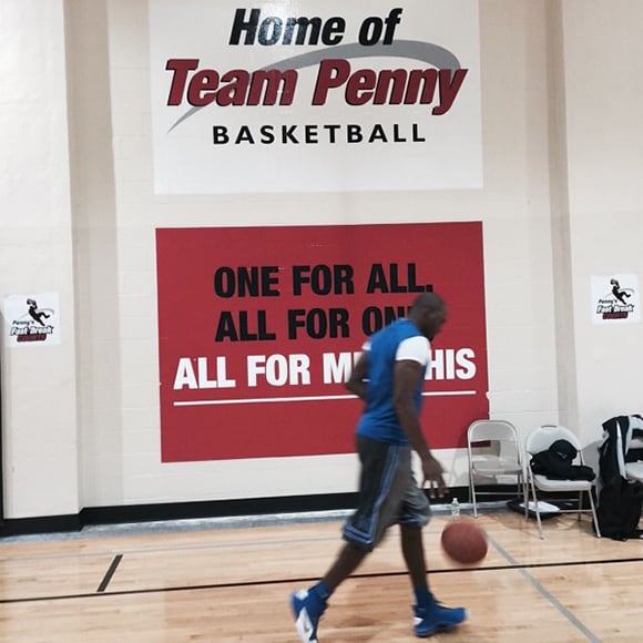 Practicing in Memphis, Hardaway had on a predominate blue pair of Nike Air Penny 6. If you squint you can also see some black used along with white. A while back, Nike released the Zoom Rookie, a hybrid of some shoes worn by Hardaway in all blue which quickly latched on to the nickname Memphis Blues.