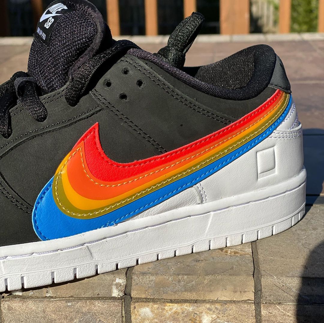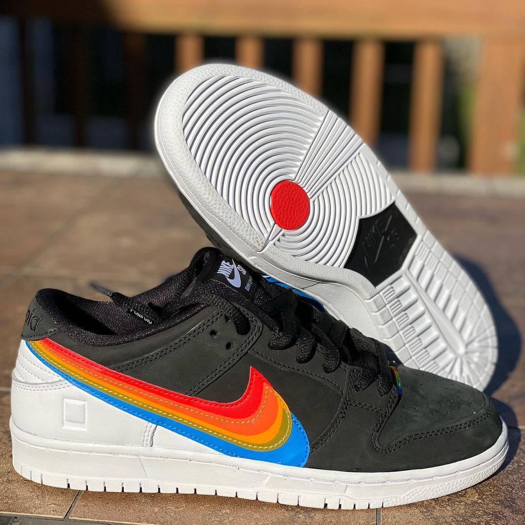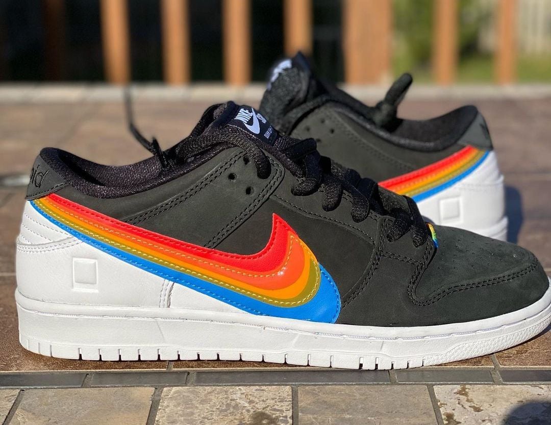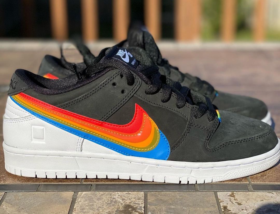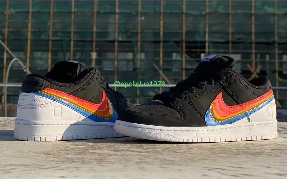 This Nike SB Dunk Low comes with Black leather across the base while White lands on the tongue branding, heel, midsole, and rubber outsole. Resembling Polaroidโs logos, we have Rainbow layered Swoosh logos on the panels consisting of Red, Orange, Yellow, Green, and Blue. Those same shades along with Nike SB and Polaroid branding appear on the insoles. Lastly, co-branding is spotted on the lace tips and heels.