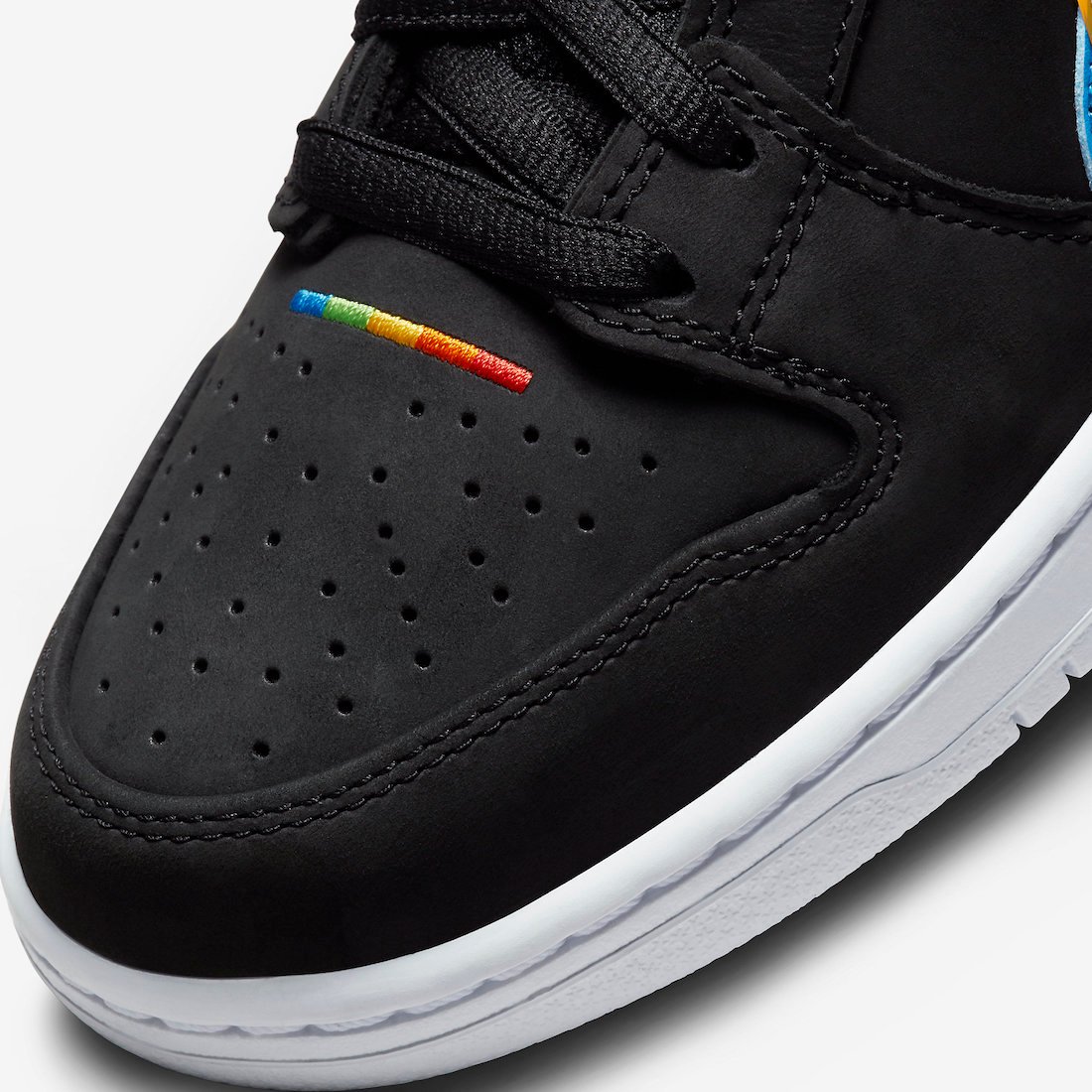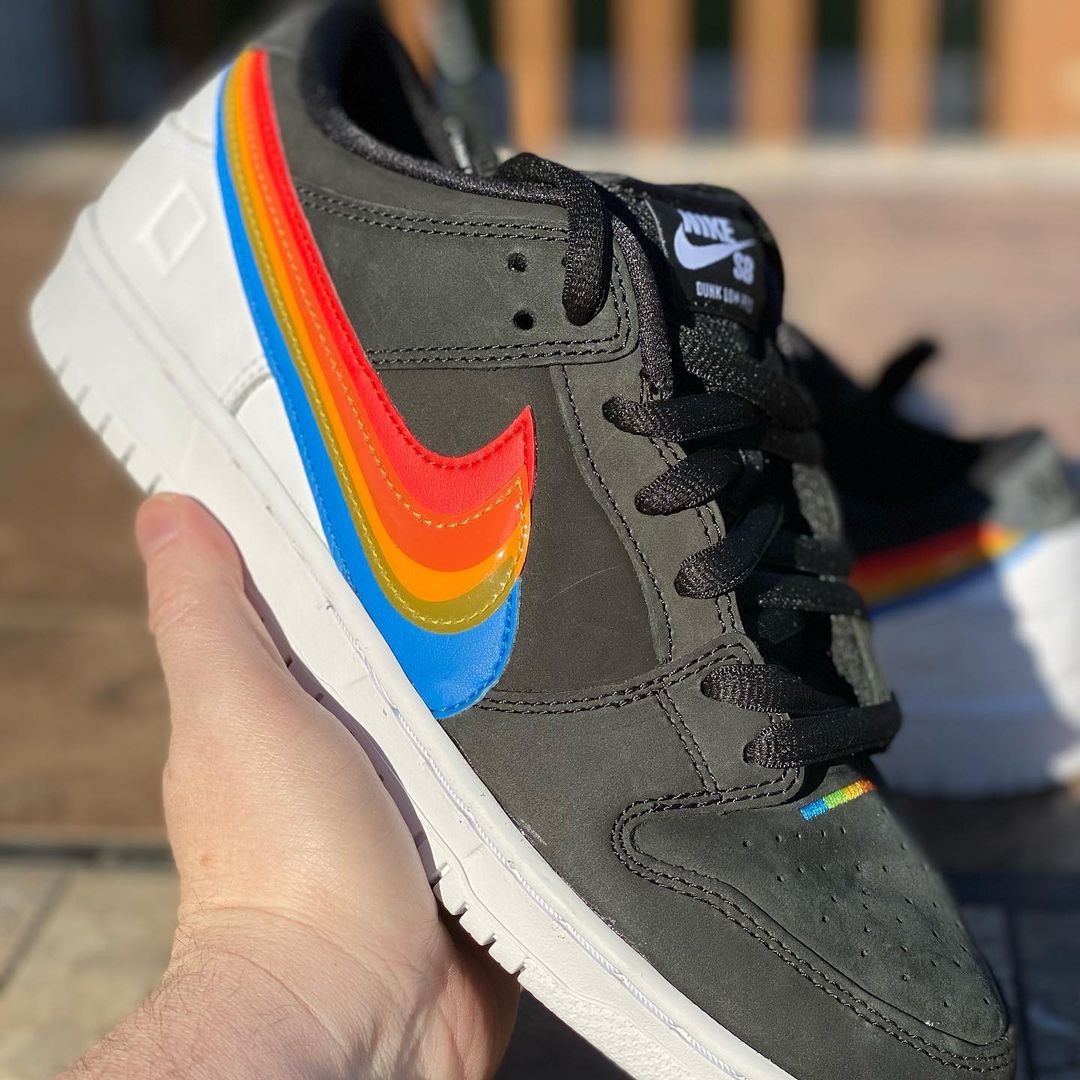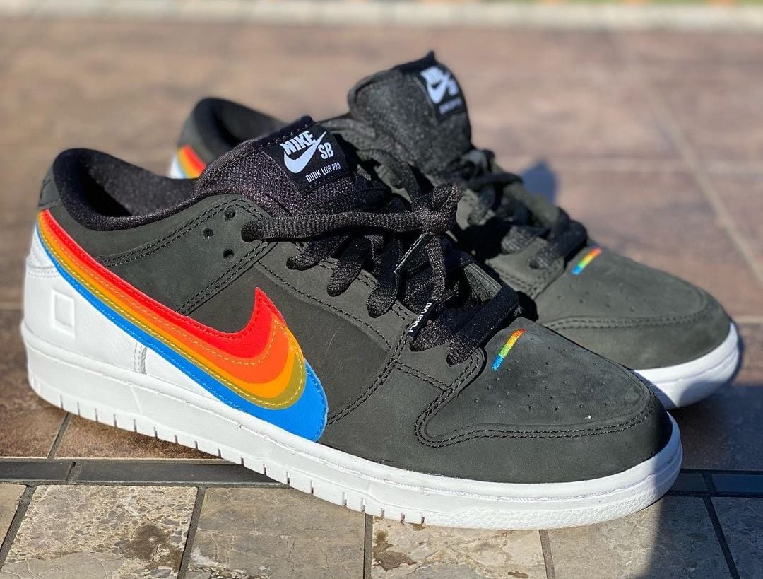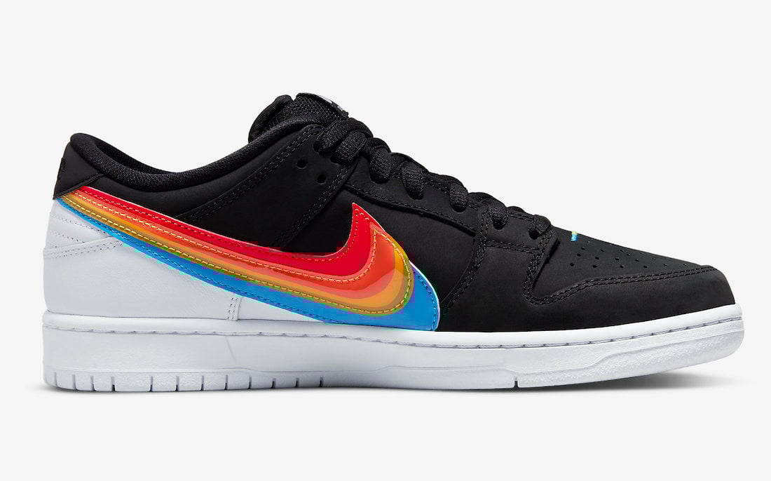 This Nike SB Dunk Low comes with Black leather across the base while White lands on the tongue branding, heel, midsole, and rubber outsole. Resembling Polaroidโs logos, we have Rainbow layered Swoosh logos on the panels consisting of Red, Orange, Yellow, Green, and Blue. Those same shades along with Nike SB and Polaroid branding appear on the insoles. Lastly, co-branding is spotted on the lace tips and heels.