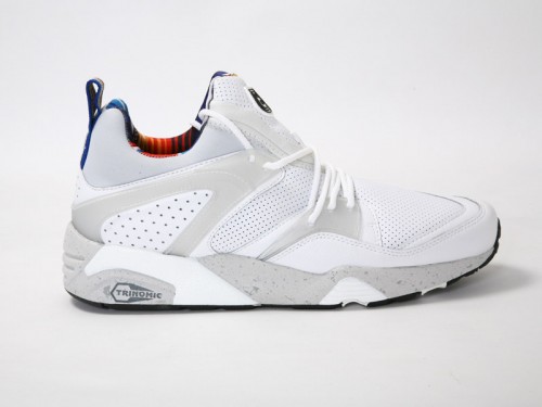 Just a few days ago we previewed the black Puma Blaze of Glory 1968 Olympic edition, here’s a further look at both styles. This time around the black and white models are placed side by side displaying the shoes Mexican influence including a blanket inner lining as well as the numbers 68 written on the tongue, referring back to the Olympic games. Now available at VA.