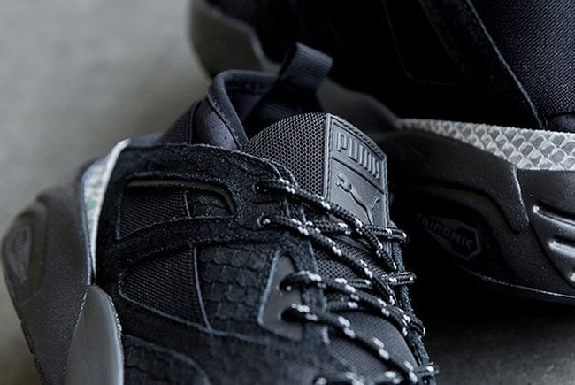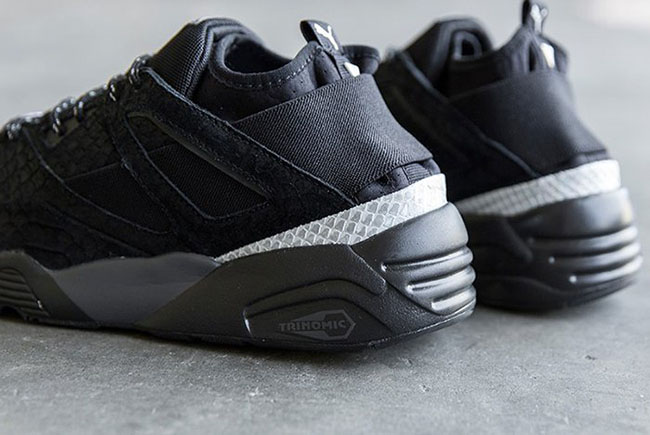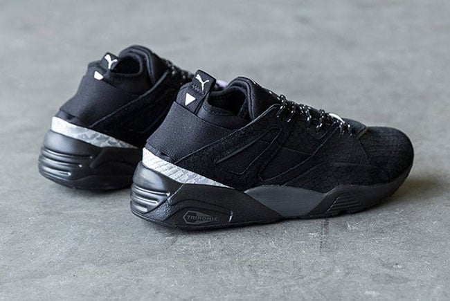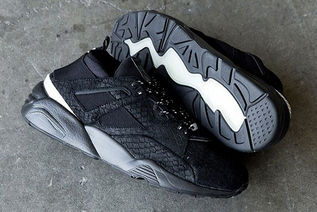 Looking closer at the Rioja edition of the Puma Blaze of Glory, you will notice a premium suede that has a snakeskin texture overlay. While dressed in mainly Black, you can also see an elastic strap that runs through the sides and wraps the heel. Along with Light Grey hints, other details includes a Trinomic cushioning setup along with Black and White across the outsole.