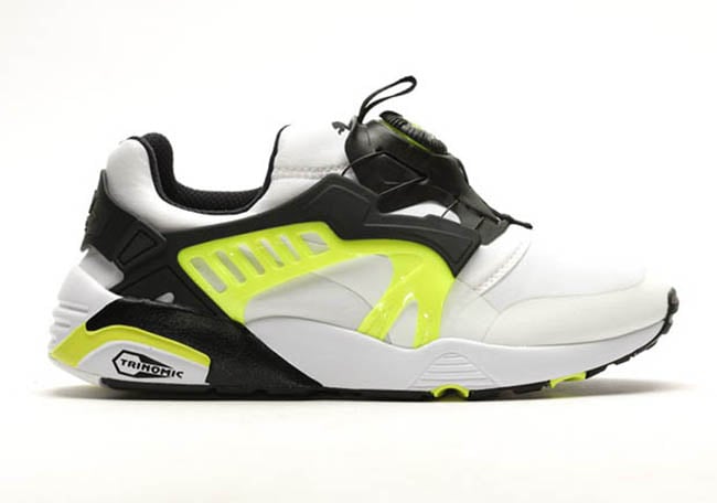 This Puma Disc Blaze features White across the base while hitting the tongue, around the collar and liner. Adding some flare is the use of Safety Yellow that lands on part of the cage, by the heel and outsole. Finishing the look is Black detailing.