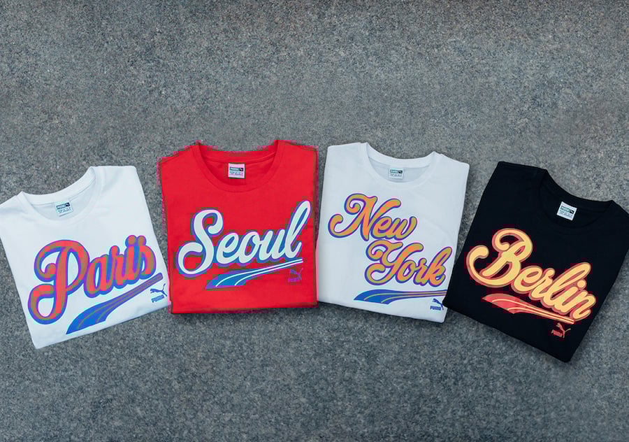 In four distinct colorways, eachย Puma Suede Classicย is embossed with a graphic treatment that celebrates its respective city and each pair has a matching tee. All come come in junior, preschool and infant sizes as well. Complementing the kicks areย Breakdance Teesย each bearing the city name.