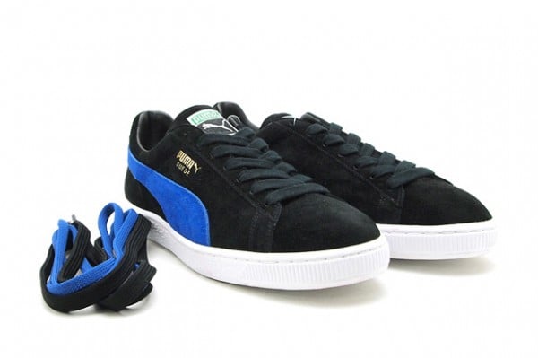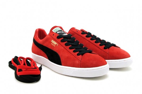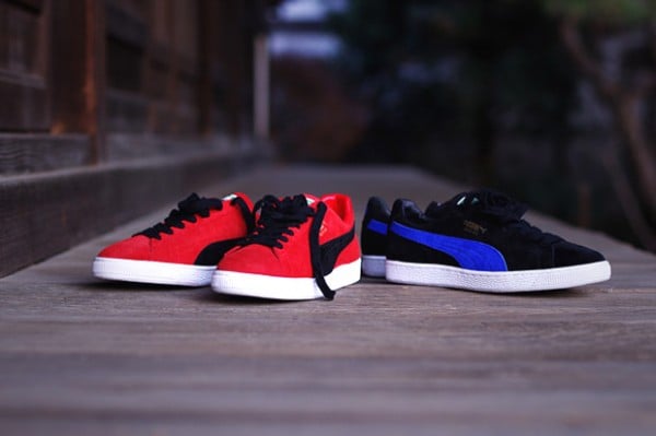 The high quality kicks come in premium suede uppers, each atop a white rubber sole and sporting black laces and a contrasting branding stripe. Finished off with gold PUMA Suede branding, the kicks come in red/black and black/blue colorways.
