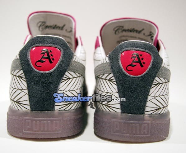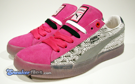 Puma’s on going Endangered Species collection continues with this Puma x Atmos x Mitsuaki Iwago, the Crested Ibis. The Crested Ibis is chosen to inspire this Clyde from all aspects. A pink upper is combined with feathered side panels to represent the bird’s wingers. Furthermore, three different sets of laces will be packaged with the Crested Ibis Clyde, each featuring the Atmos “A” on the tips and heel. Release is slated for July 26, 2008 at Atmos NYC and Ubiq in Philadelphia.