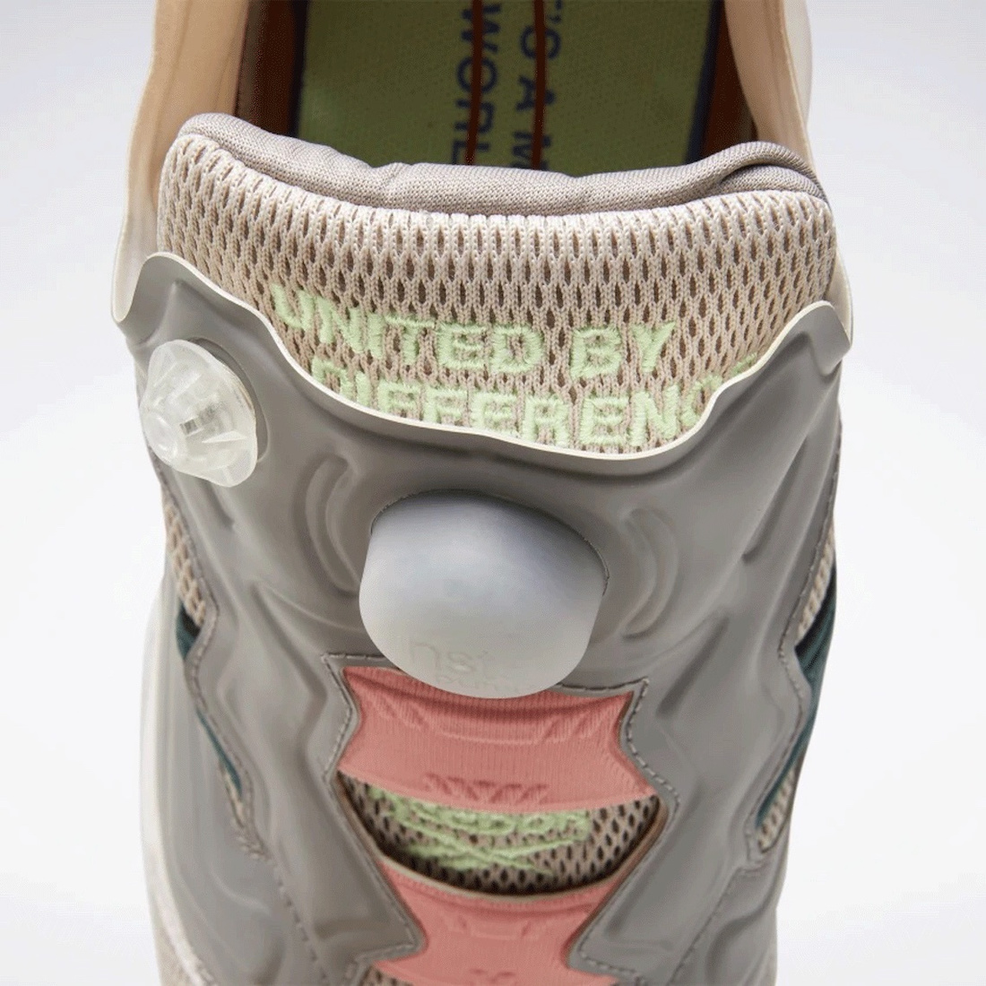 This Reebok Instapump Fury comes dressed in a Ceramic Pink, Baked Earth, and Twisted Coral color combination. First, the pair comes constructed with textile mesh, leather, and suede which expands across the upper. Next, we have a special message on the shroud that reads, โUNITED BY DIFFERENCEโ. Lastly, we have more messages on the insoles.
