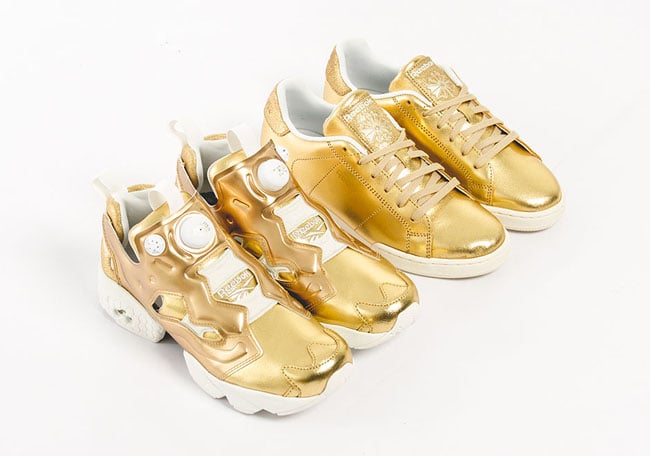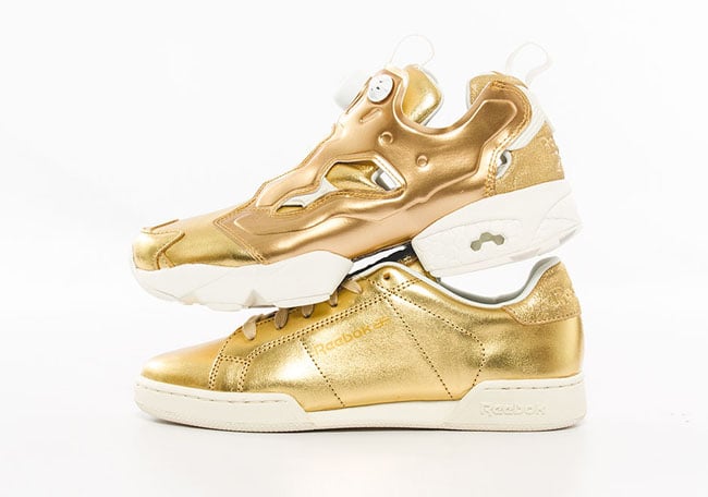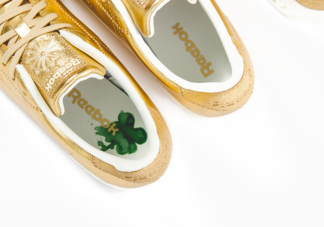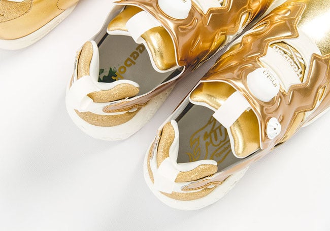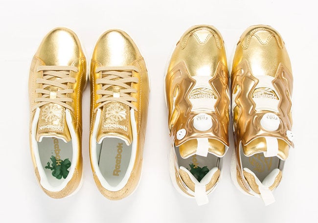 Each pair will feature a similar theme while using Metallic Gold foil through the uppers which is sure to get some attention. White detailing is then seen on the liner, heel tabs and Pump (only Insta Pump Fury), through the midsole and branding. Completing the looks is a green clover placed on the insole.