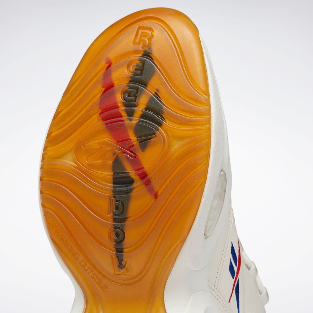 This Reebok Question Mid features Chalk White tumbled leather on the upper while Red leather appears on the toe, heel, and trimming on the tongue. Next, Royal Blue and Gold land on the tongue and side branding, down the eyelets, heel, and insoles. Lastly, a Gum translucent rubber outsole finishes the look.