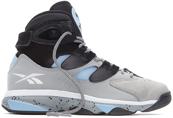 The Brick City Reebok Shaq Attaq 4 features grey and black uppers with minimal hits of white. A nice shade of California blue lands on the tongue, midsole, and sides.