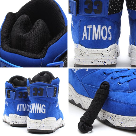 Atmos being able to collaborate with Ewing Athletics is an achievement in itself as they are only the second shop to join forces for the Ewing 33 Hi. They both decided to go with a blue suede upper, black lands on the strap with glow in the dark spots while other detailing on the shoes glows as well. White lands on the midsole as well as the branding. Atmos and Ewing can be seen on the heels of the shoes.