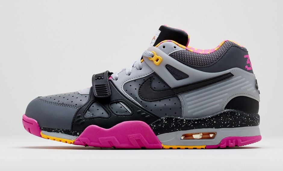 With that said, Bo Knows Horse Racing. Pairing up premium leather and synthetic materials with an official dark grey, black, wolf, grey, and club pink colorway, this Nike Air Trainer III (3) features a pixelated image on Bo on his horse along each inner lining, has similar tongue logos with “34” heel branding to signify Bo’s retired jersey number, plus icludes an interior that references the jockey jersey.