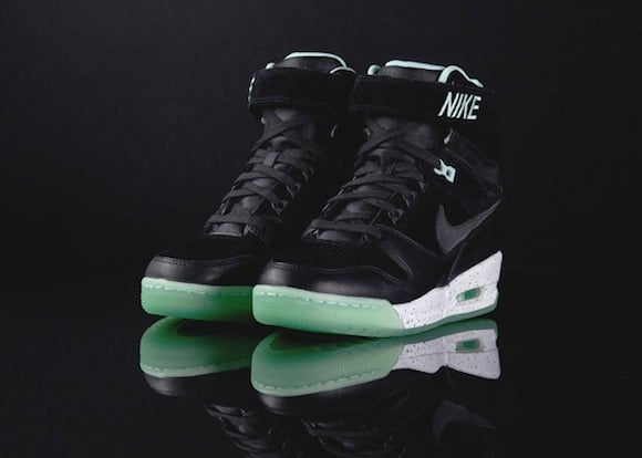 It wouldn’t be right of Nike to release a “His” without a “Hers”. Making its way to retailers today as part of the “Loverution Pack“, here’s a reminder to pick up the Nike WMNS Air Revolution Sky Hi QS “Black/Black-Arctic Green”.