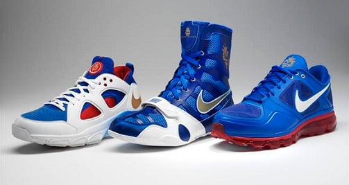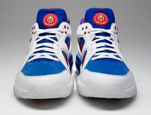 Last year we saw a “Fight Night” Nike Zoom Huarache Trainer low inspired by Manny Pacquiao- boxing SPECIALIST. Tonight at midnight, Nike commences the launch of a new collection commemorating Pacquiao’s upcoming bout against “Sugar” Shane Mosley on May 7th. The collection begins with yet another Nike Zoom Huarache Trainer low- pictured here. This pair comes in a white base with blue and red highlights and a gold swoosh- most of the colors we’re used to seeing while Pacquiao’s in the ring (with the belt around his waist). These are a very limited release (with only a few being made available from certain retailers as Eastbay and the online Nike store), so do your research before wasting your time. Good luck! And, by the way, check out a shot of the complete Nike collection after the jump.