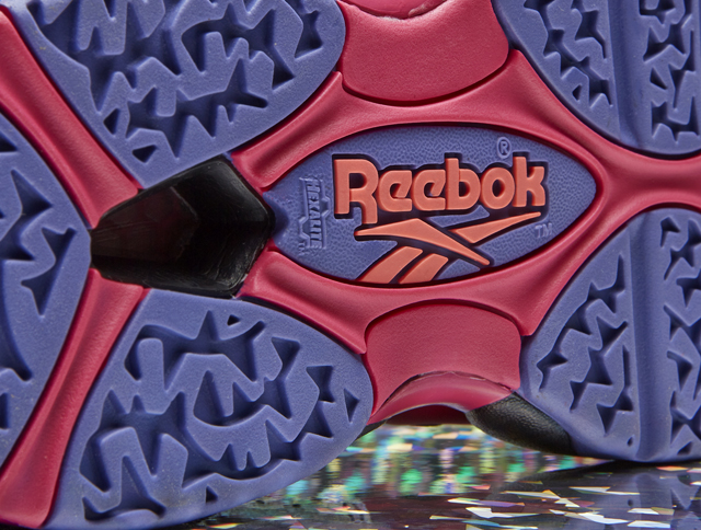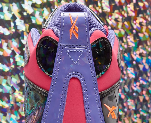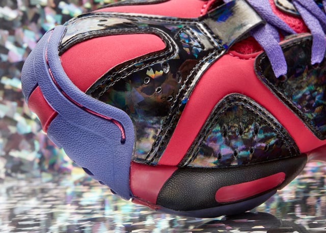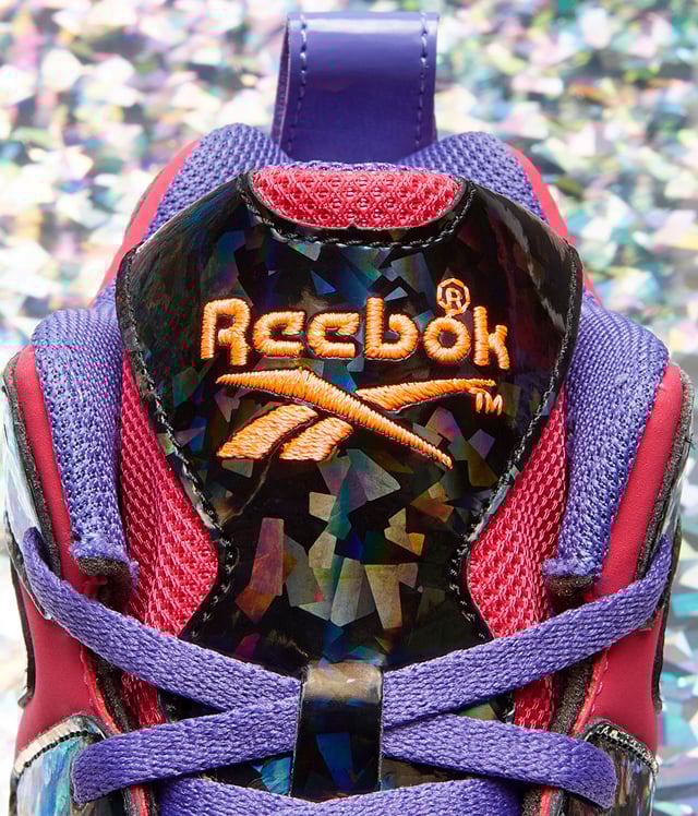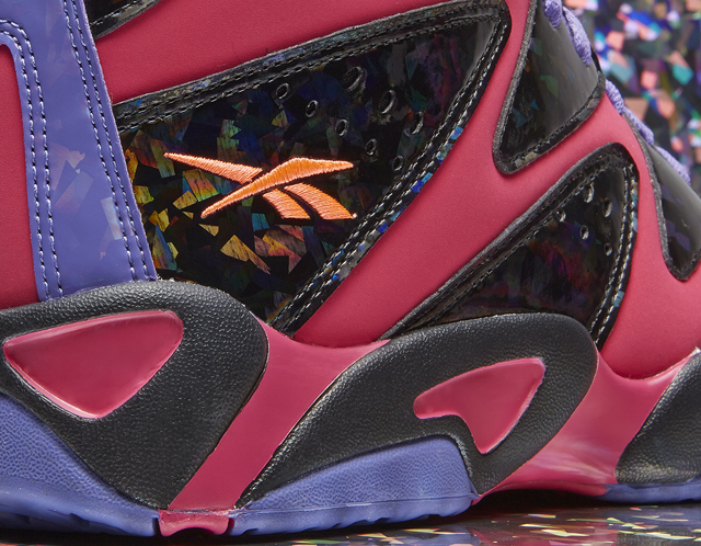 Characterized by its glamorous iridescent motif, this Reebok Kamikaze I boasts a confetti aesthetic with hot pink overlays, patent leather uppers, soft purple accents, contrasting orange signature branding, and more.