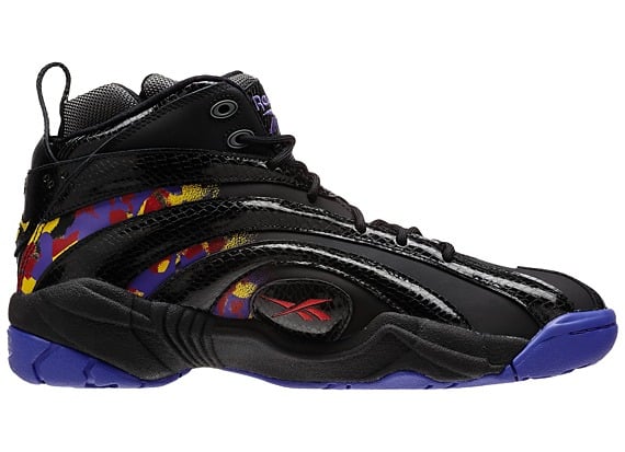 As mentioned before, this Reebok Shaqnosis takes on a black nubuck and patent leather base and adds in a fresh mix of purple, gold, and red accents to reiterate Shaq’s former team colors.