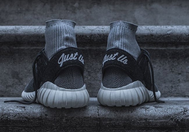 The overall design reflects all facets of the fast-paced New York lifestyle which becomes even more demanding during the winter months. The shoe’s smart but streamlined design boasts functional Primeknit technology in the form of a wrap-around sock-like upper supported by a woolen cage for added warmth. Paired with the robust marled elastic straps at the quarter panel and forefoot further stabilization and protection against the elements are guaranteed. The grey hues of the Tubular Doom as well as its clean off-white sole, complemented by Kith’s slogan โJust Usโ on the heel guard, add to the no-nonsense aesthetic of this first release on the Consortium Tour.