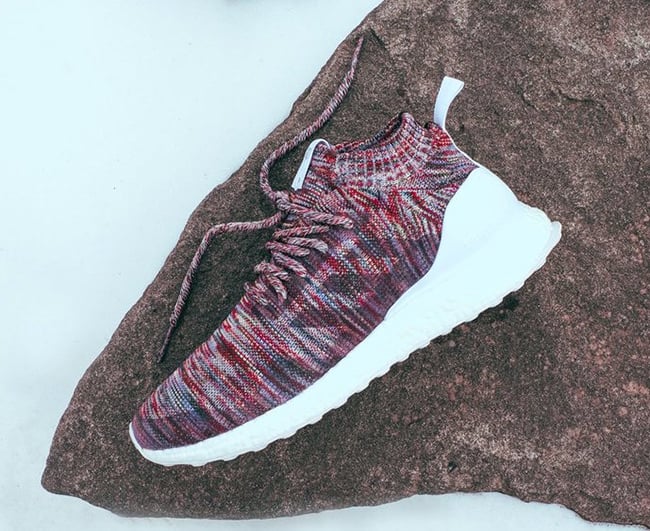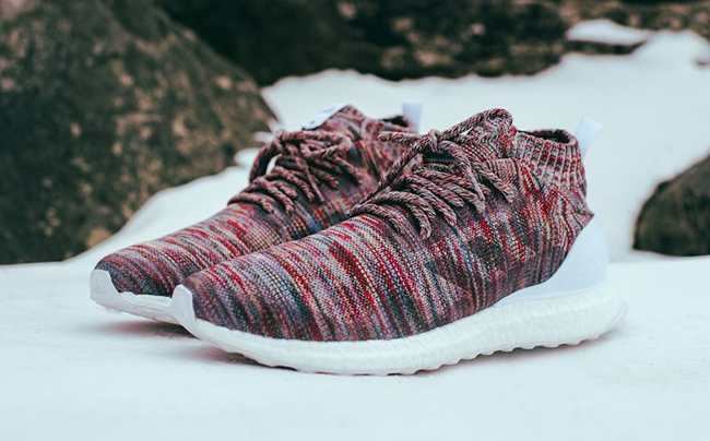 The adidas Ultra Boost Mid features a ribbed sock-like appearance for a snug fit, while additional padding locks the wearerโs foot in place for a sturdy ride. Next, the upper is cage-less, instead opting for taped panels that create a subtle branding nod. Another first for Adidas is the all-over multicolored Primeknit upper, which utilizes a seasonal palette for the winter climate. The Primeknit is made from a wool-blend fabric for the winter, and is executed in a much denser knit than normal to retain warmth. Other details include added heel pulls for increased accessibility, matte white heel cups to complement the white BOOSTโข midsole and tonal Continental outsole. Lastly, the laces are created from the same multicolored Primeknit to match the upper perfectly.