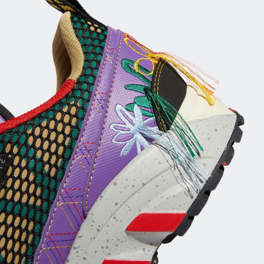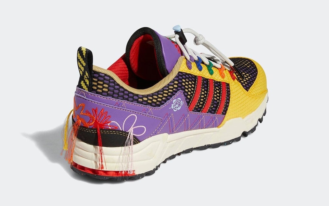 Going over this adidas EQT Support 93 by Sean Wotherspoon, it comes dressed in vibrant shades of Purple, Yellow, Light Blue, Green, and Orange. Once again, the pair will come constructed with vegan and recycled materials. Utilizing Yellow and Black mesh on the overlays while Multicolor adorns the eyestays, and the traditional threads are hanging from the heel. Other details include floral embroidery on the heel, co-branding on the tongue and insoles, and each pair comes housed in a special box.