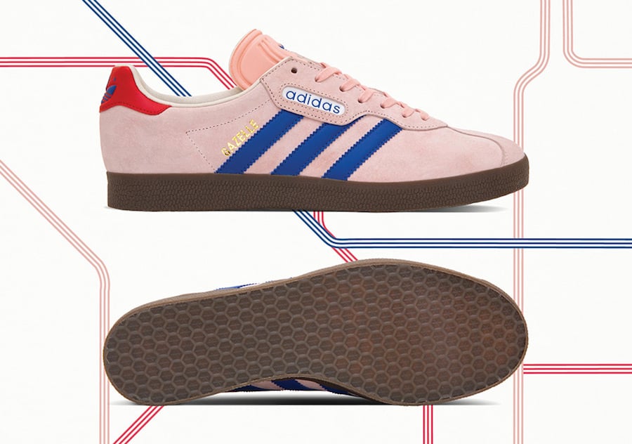 The colorways for each shoe involved in the โLondon to Manchesterโ pack reference tickets and travel cards used to journey across the city to your teams hallowed ground. London is represented by two inverted Blue and Pink combinations on the Gazelle Super that will get you onto the London Underground, snaking through the underbelly of the city. Both shoes are dressed with suede and nubuck uppers and finished off with a Red heel tab and brand detailing.