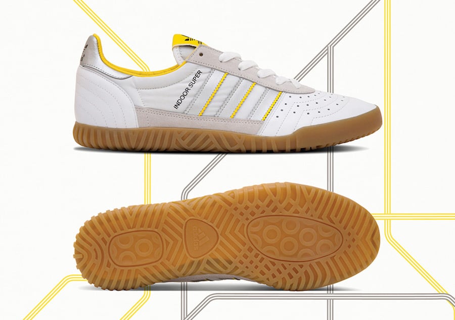 Further up North and above ground, Manchesterโs rendition comes in the form of a White and Yellow Indoor Super. A three material hit of suede, leather and nylon sit in their rightful spots above the Brown Gum midsole unit, and are accented with Silver leather touches on the three stripes and heel tab.