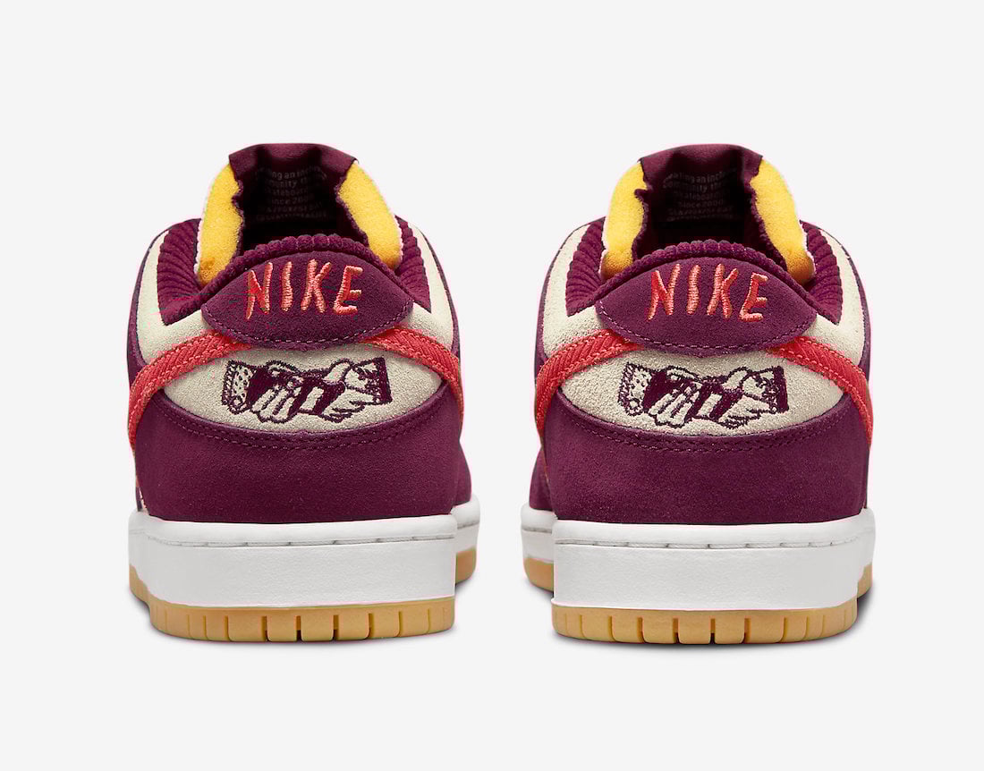 This Skate Like a Girl x Nike SB Dunk Low features Off-White on the base, ankle, and toe while constructed with suede. Next, Maroon suede adorns the overlays while corduroy constructs the tongue, liner, and Red Swoosh on the panels. Skate Like a Girl branding lands on the tongue labels with a handshake motif on the heel. Other details include a White midsole and a Gum rubber outsole.