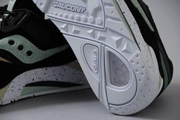 The Sneaker Freaker x Saucony Grid 9000 “Bushwhacker”ย features a predominately black suede, mesh and neoprene look with matching laces and lace locks, mint green and tan accents and a white and mint splattered midsole.