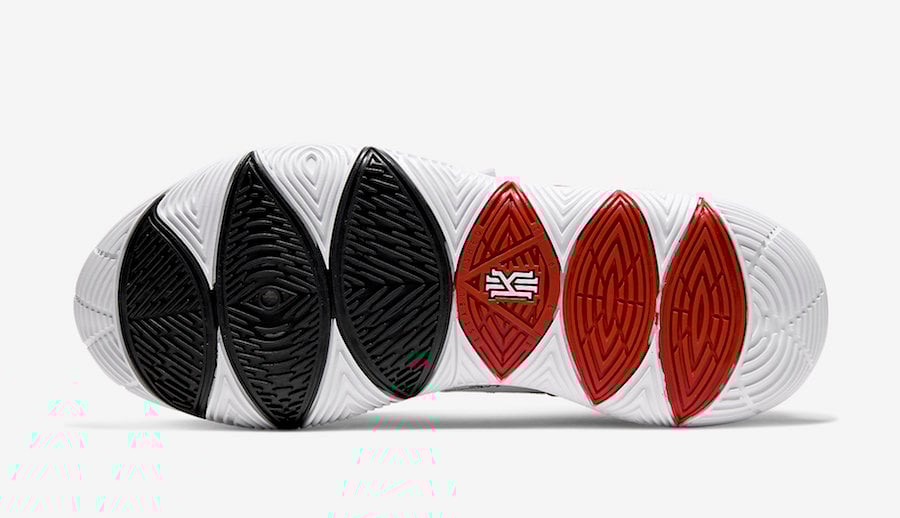 Three color options of the Kyrie 5 is shown which comes in Red, Black and White. Inspired by the passing of their mothers, each shoe comes with colored hearts on the upper while an embroidered rose logo lands on the heel. Finishing the look is polka dots on the liner.