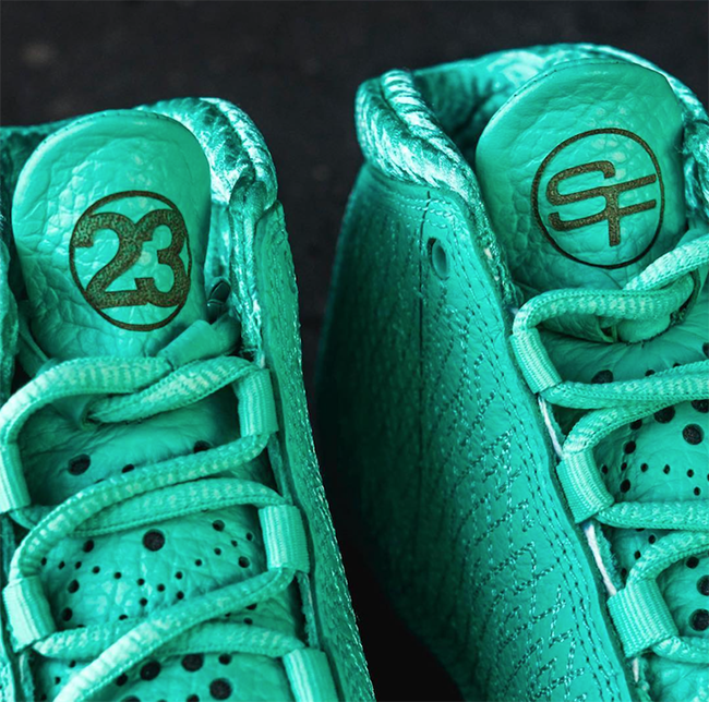 More specific, this Air Jordan XX3 by SoleFly pays tribute to the Florida Marlins winning their first World Series back in 1997. As you can see, they feature Hyper Turquoise Green that reflects the teams jersey from that time. In addition we have the number โ23โ on the right tongue and โSFโ for SoleFly on the left tongue.