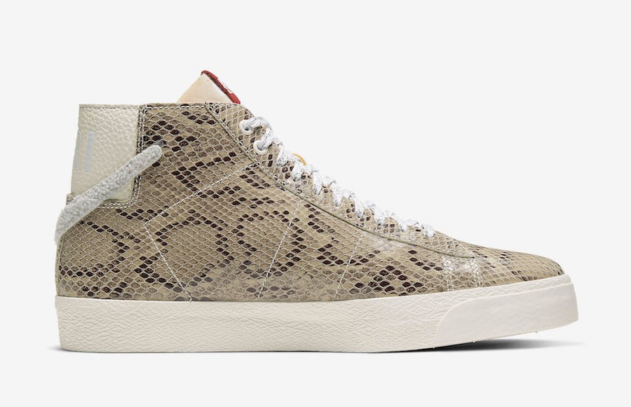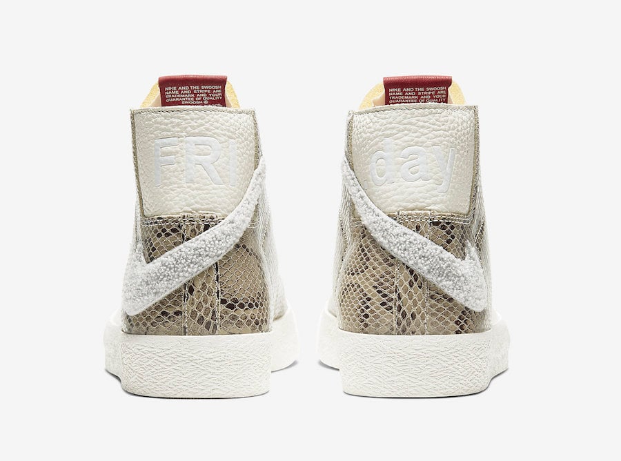 This Nike SB Blazer is inspired by Tokyo and the Japanese skateboard culture. Looking closer they feature snakeskin across the upper along with a chenille Swoosh across the heel and a Jewel Swoosh on the panels done in Pearl. Following we have FRI.day on the heels with tumbled leather while Red hits the tongue label. Finishing the look is a White rubber midsole.