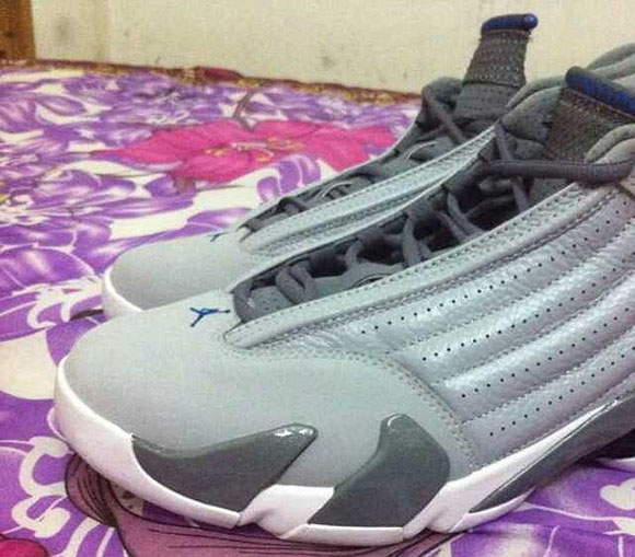 Similar to the Graphite pair that released back in 2011, the Sport Blue Jordan 14 uses wolf grey with leather on the side panels and nubuck around the toe box. Sport Blue accents the Jumpman logo, tongue and heel.