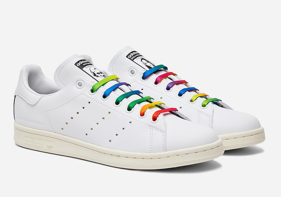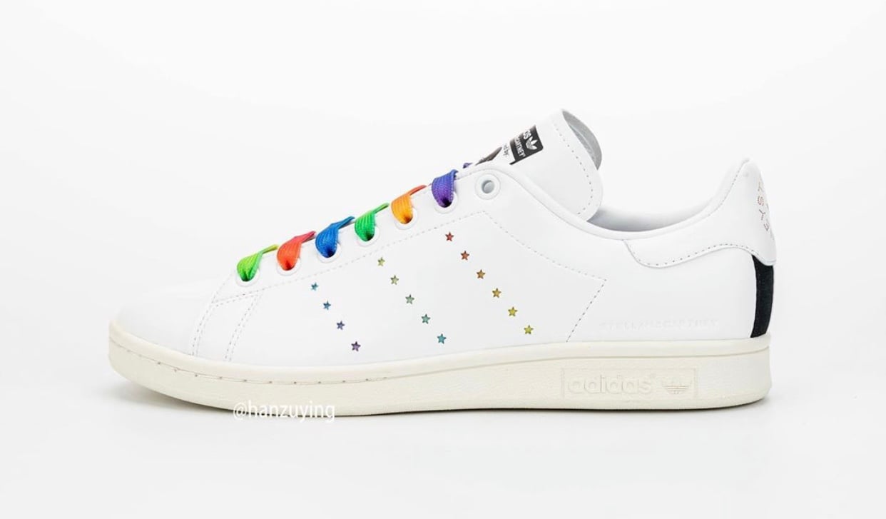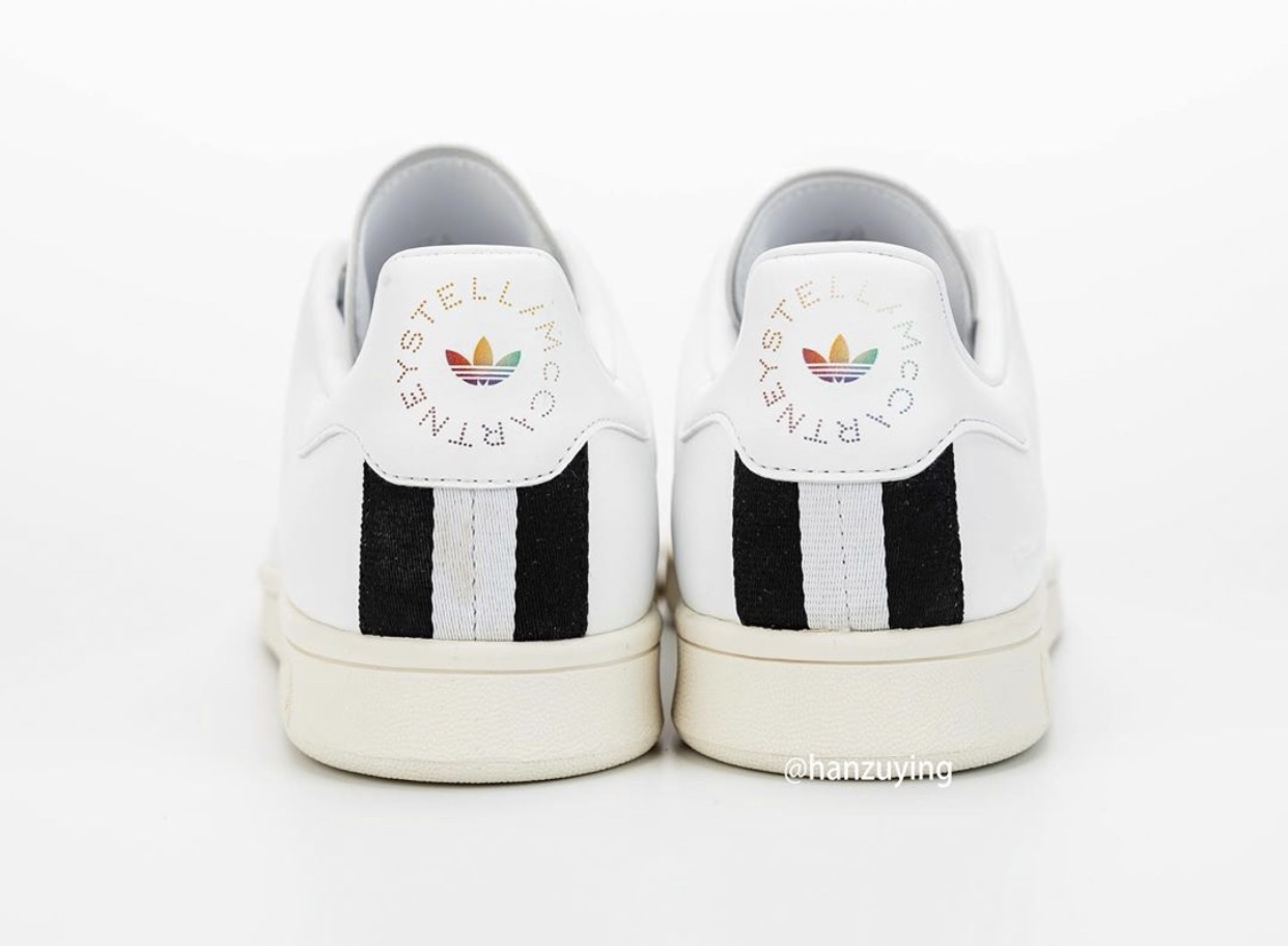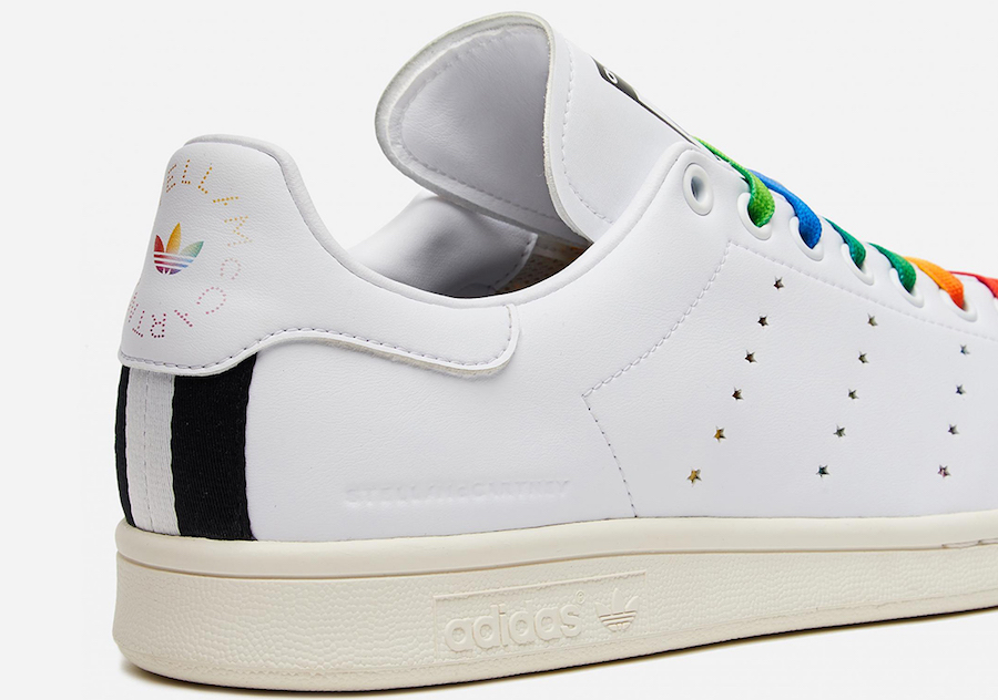 This adidas Stan Smith is leather free and comes constructed with vegan materials. Instead of the traditional Three Stripes branding on the panels we have laser-cut stars that look punched out and comes in various colors. The same rainbow look lands on the laces while Stan Smithโs face still lands on the right tongue. Completing the look is McCartneyโs portrait and signature on the left shoe.