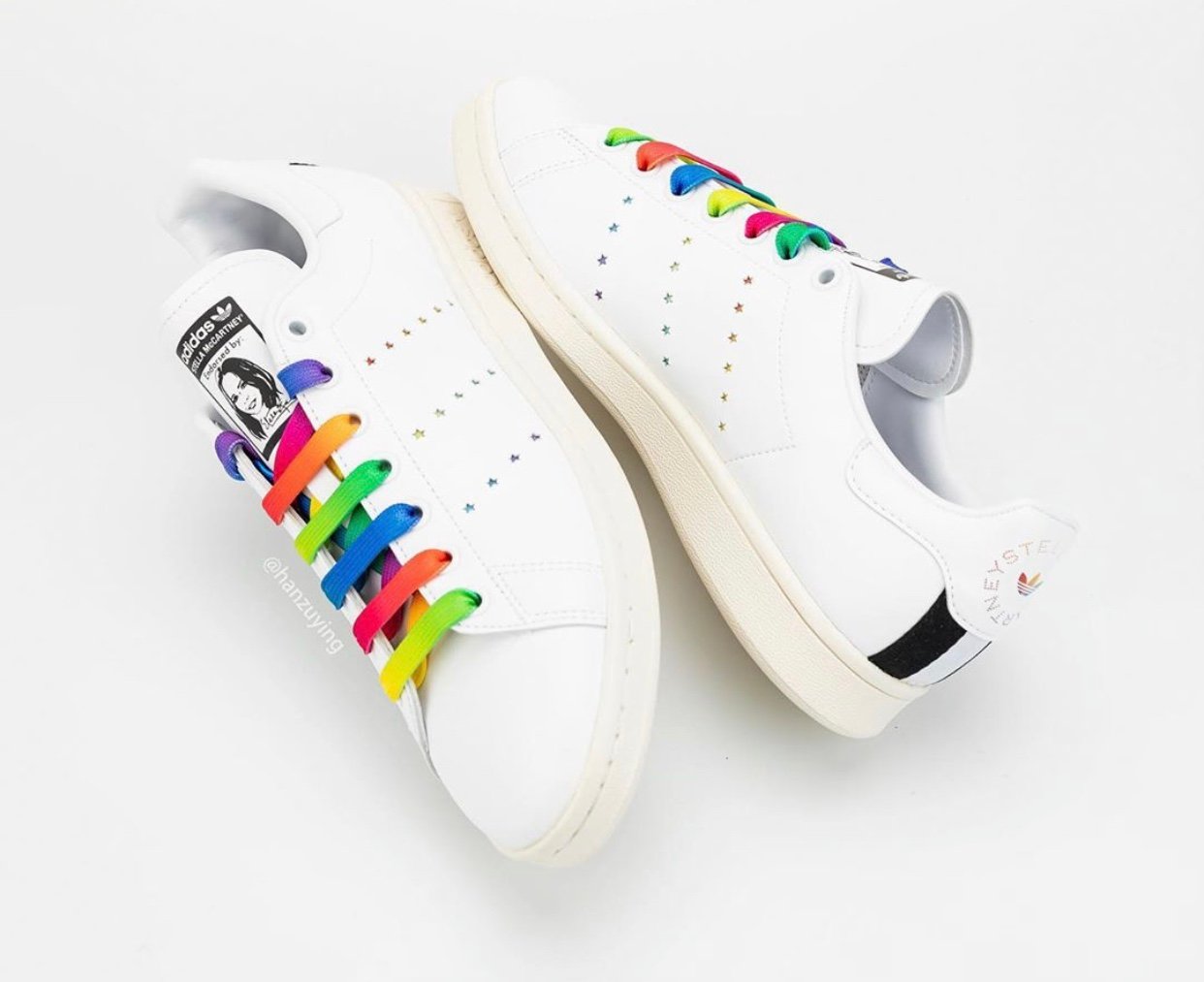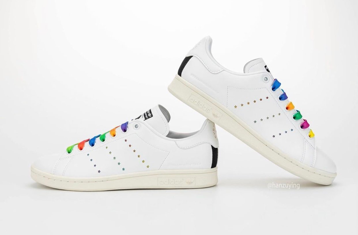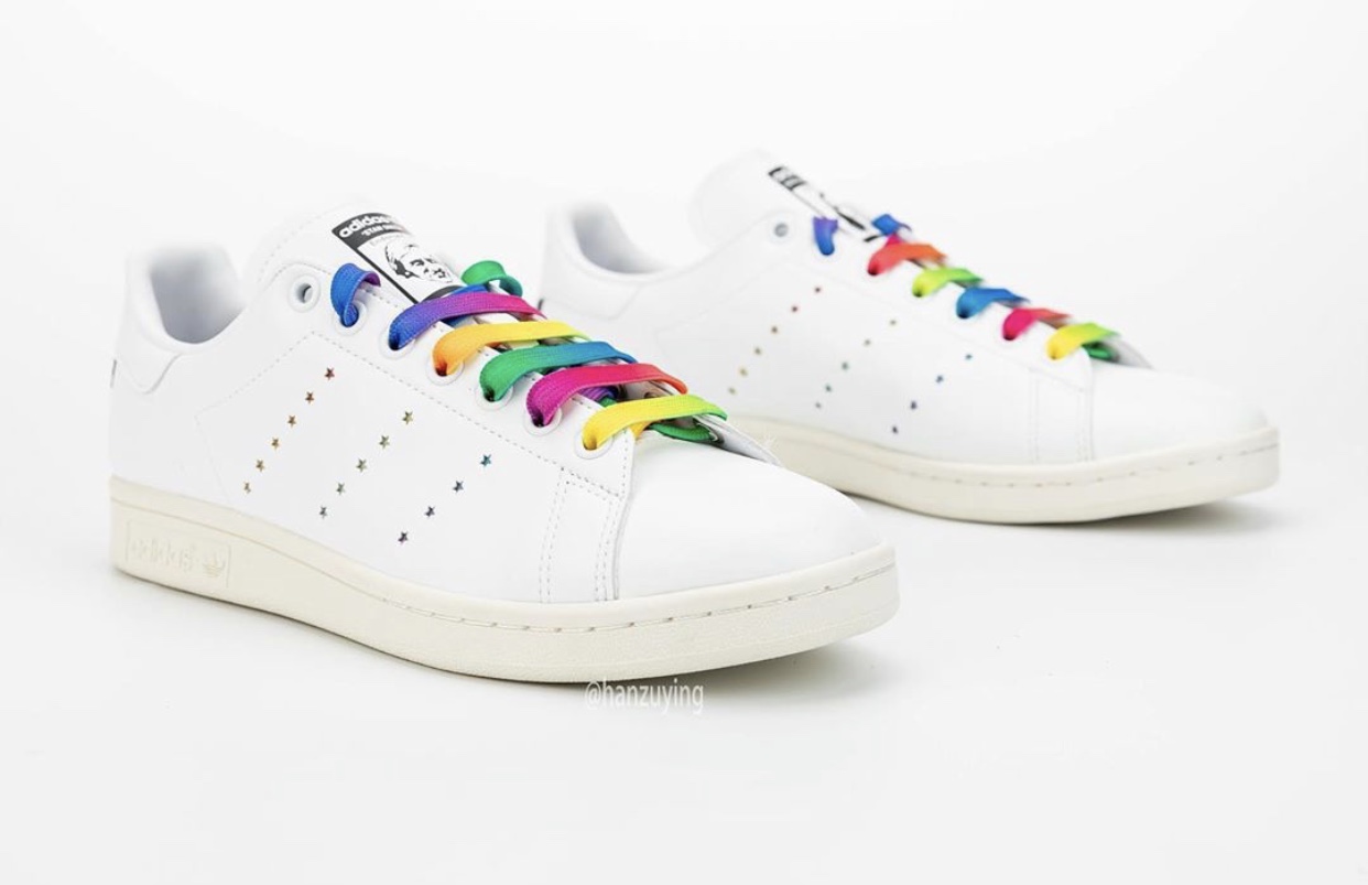 This adidas Stan Smith is leather free and comes constructed with vegan materials. Instead of the traditional Three Stripes branding on the panels we have laser-cut stars that look punched out and comes in various colors. The same rainbow look lands on the laces while Stan Smithโs face still lands on the right tongue. Completing the look is McCartneyโs portrait and signature on the left shoe.