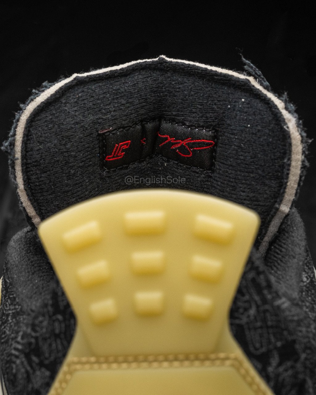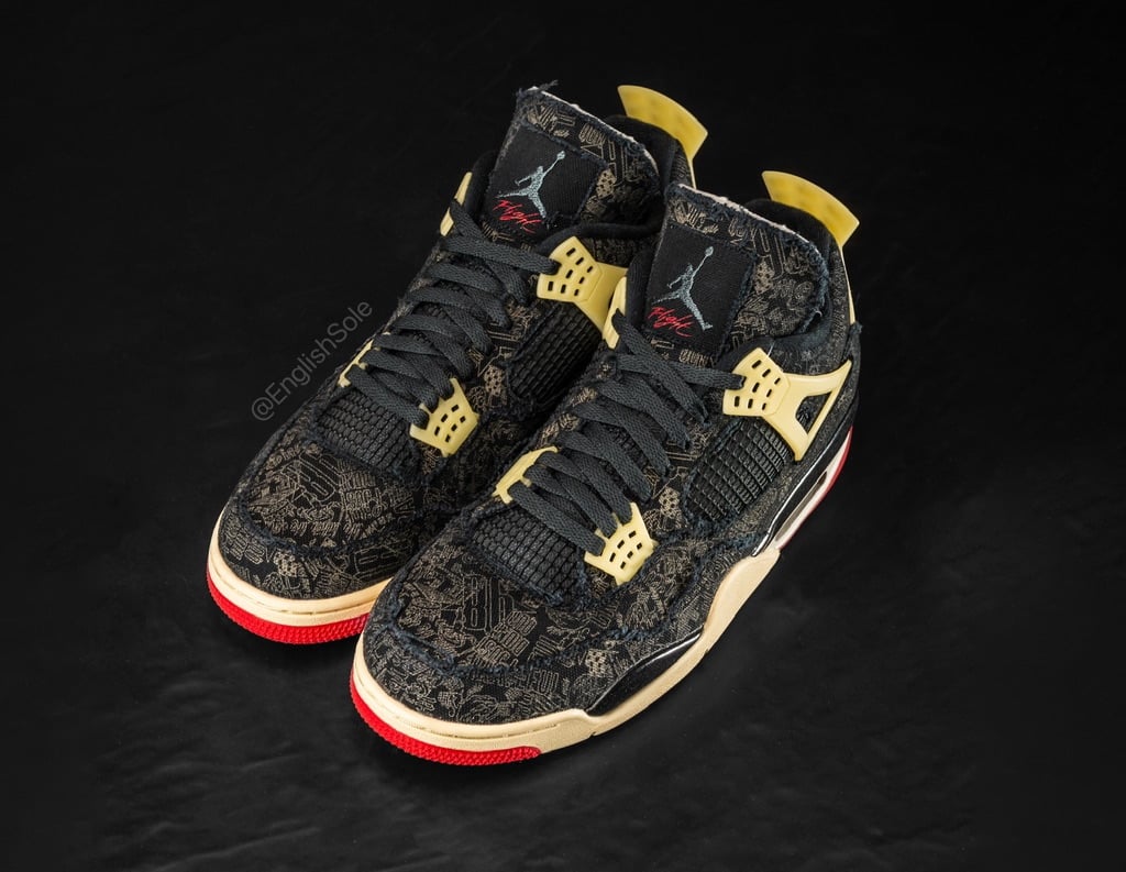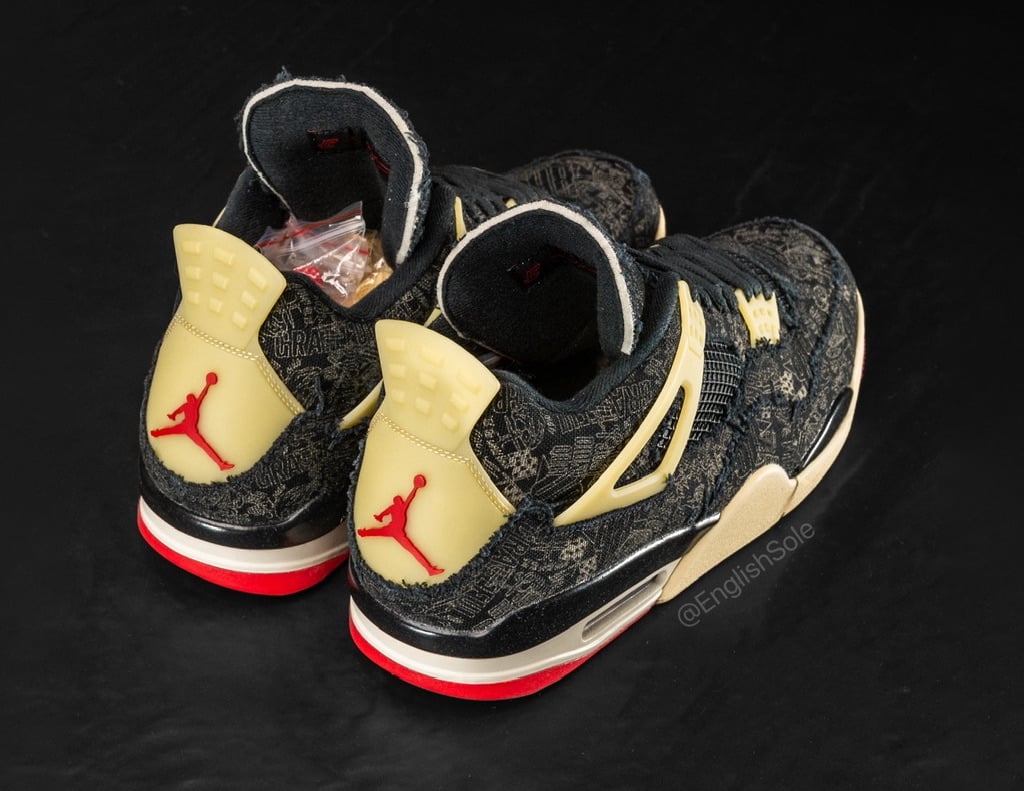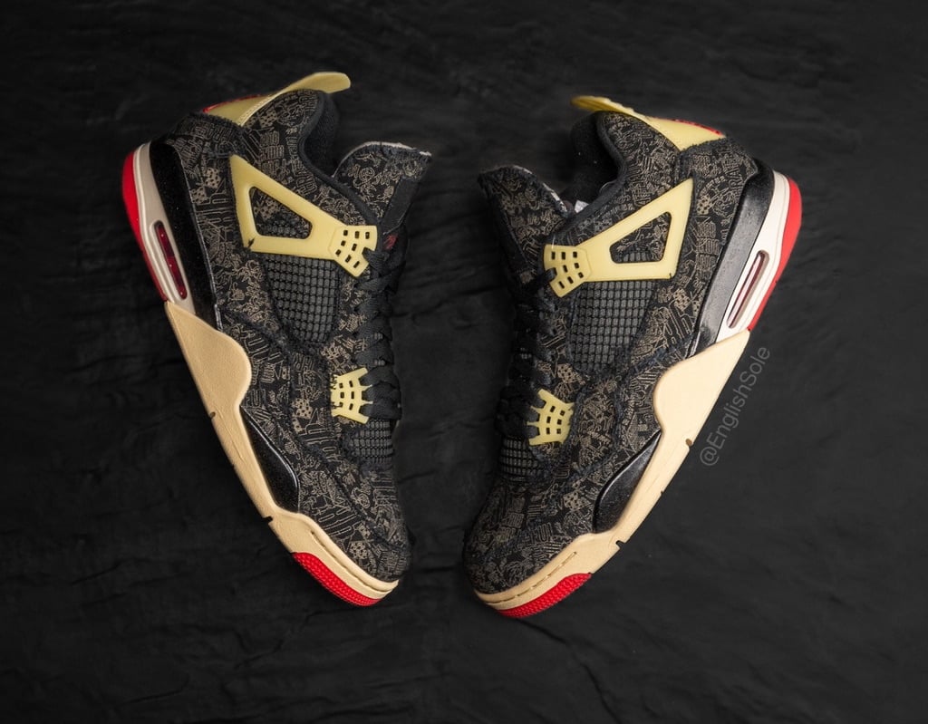 The Steve Wiebe x Air Jordan 4 PE features a Black distressed textured upper with laser etching of Tatumโs tattoos on the base. Next, a Milky translucent finish adorns the wing eyelets and heel tabs. Other details include Red threads, Jumpman branding on the tongue and heels, and a Cream hue on the midsole.