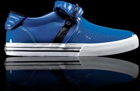 Supra has focused on several different looks yielding some clever concautions, with the most recent design resulting in this Supra Cuban. The Cuban offers a subtle blue patent leather upper with black accents and chain. Supra has kept up their patent leather theme with this Cuban and recycled it on many of their popular styles, it is only a matter of time till we see other blue patent leather models. Look for this Cuban to hit Supra retailers like Factory 413 soon. Via Complex.