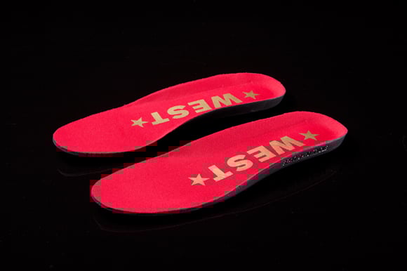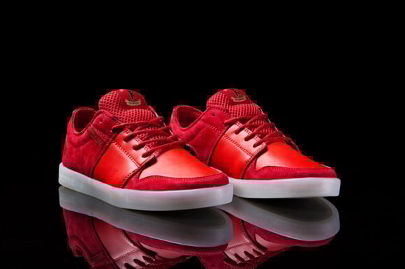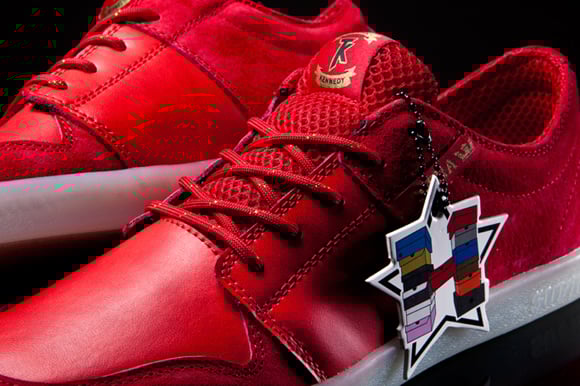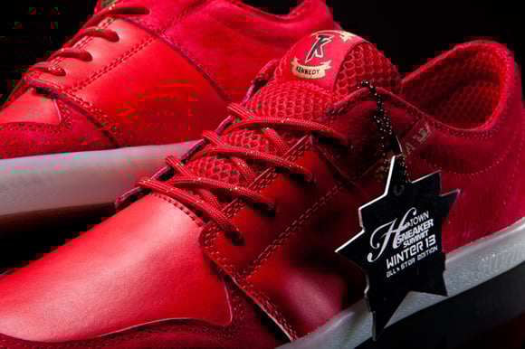 The Stacks has “Trill Kennedy” on the tongue, red leather, red pig suede, basketball inspired toe box, red mesh lining, ice sole, custom West sock liner and gold accents.