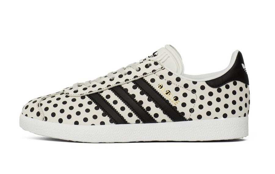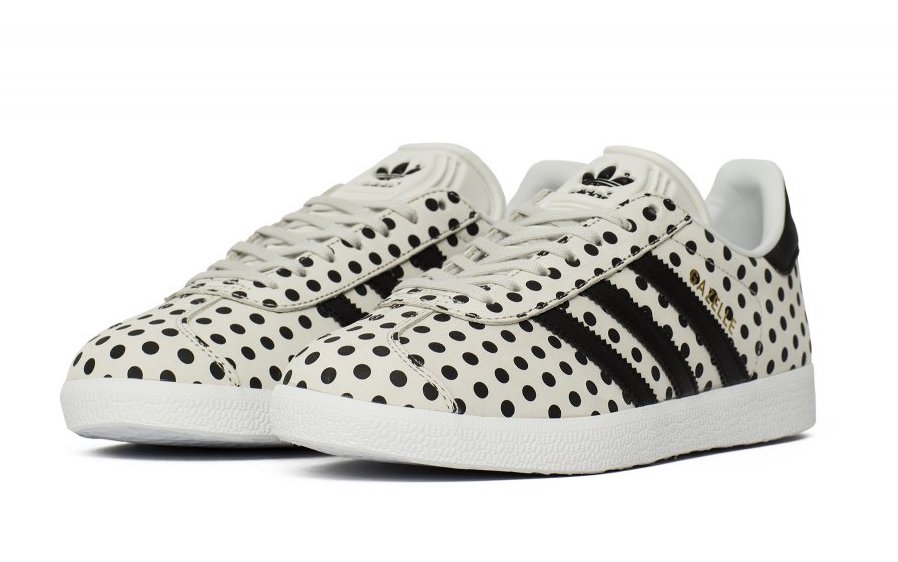 As you can see this pair features a dot pattern throughout which is inspired by Brazilโs โlittle stepโ street dance which is also known as โpassinhoโ in Portuguese. Looking closer they feature suede on the upper while leather lands on the liner. The Gazelle branding features Gold which completes the look.