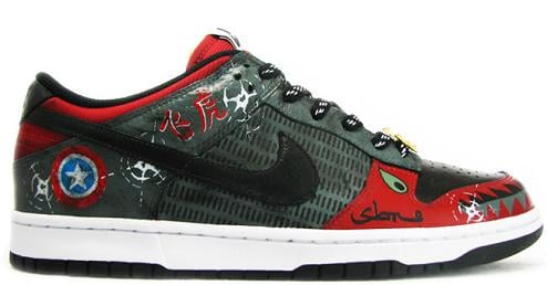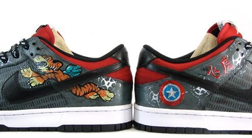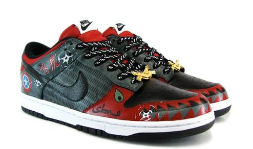 While February 14th in the U.S. marks the holiday which pairs of sneakers including the Nike Air Force 1 low and Big Nike high have been made to commemorate, not everyone’s going to be doing the Valentine’s Day thing. February 14th also marks the beginning of the Chinese New Year (as they follow a lunar calendar); and, this year is the year of the Tiger. To celebrate, sneaker customizer SBTG has decided to intricately illustrate the Nike Dunk low silhouette with a design borrowing cues from the 1941 fighter plane that the first American volunteer group in the Chinese Air Force painted on. This Nike Dunk low “Flying Tiger” is available for order now from RoyaleFam.