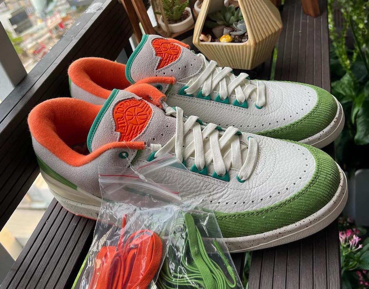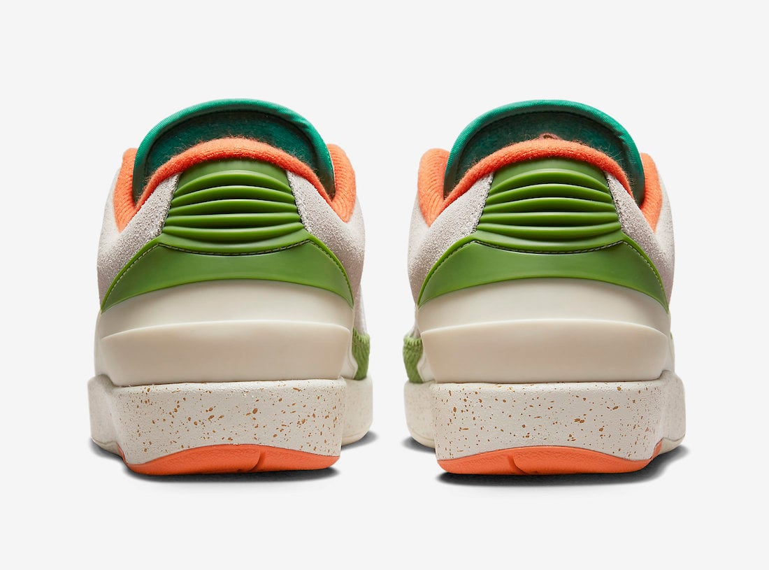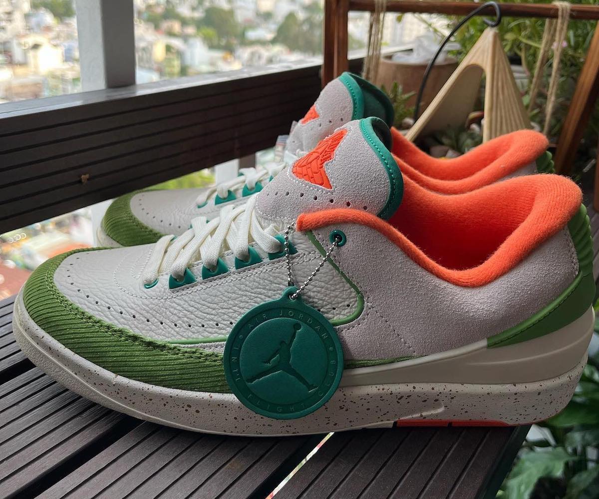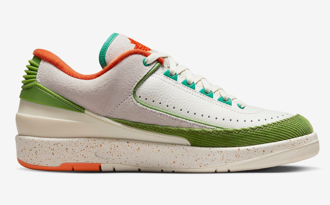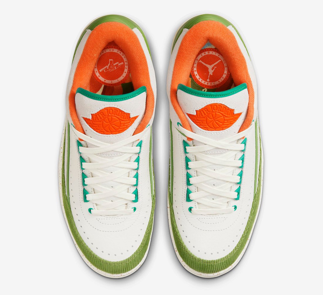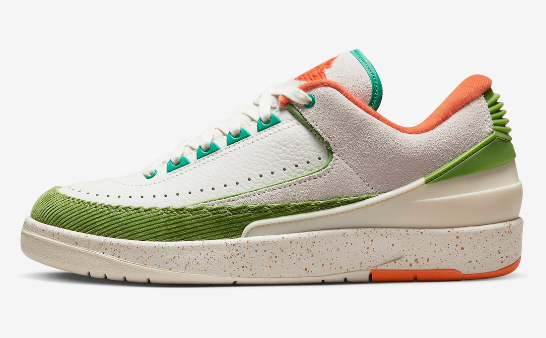 This low-top Air Jordan 2 comes dressed in a Sail, Safety Orange, Chlorophyll, and Coconut Milk color combination. Across the upper, we have a leather Sail with a tumbled finish, and Grey suede drapes the overlays. Next, Chlorophyll Green corduroy wraps the toe box and expands to the sides, and Orange adorns the liner and Jumpman on the tongue. We also have Teal eyelets and on the very top of the tongue. Other details include speckled detailing runs across the midsole, Titan branding on the hangtag, and special Titan graphics on the insoles.