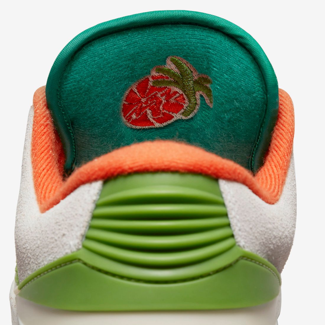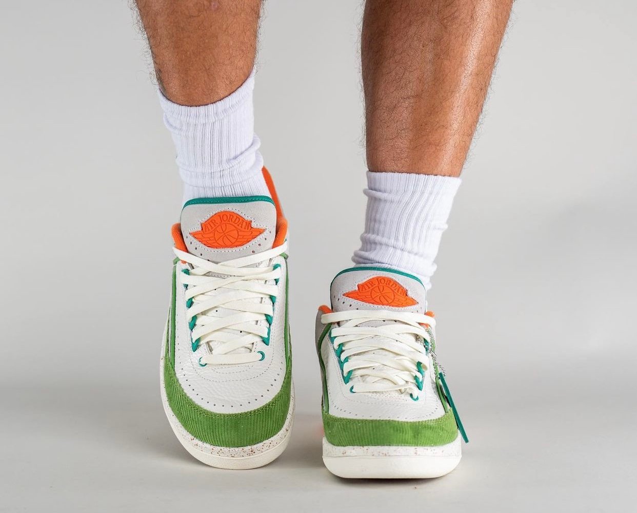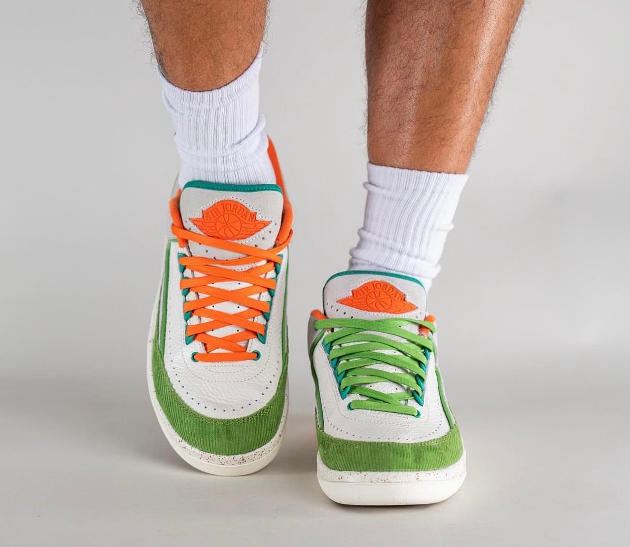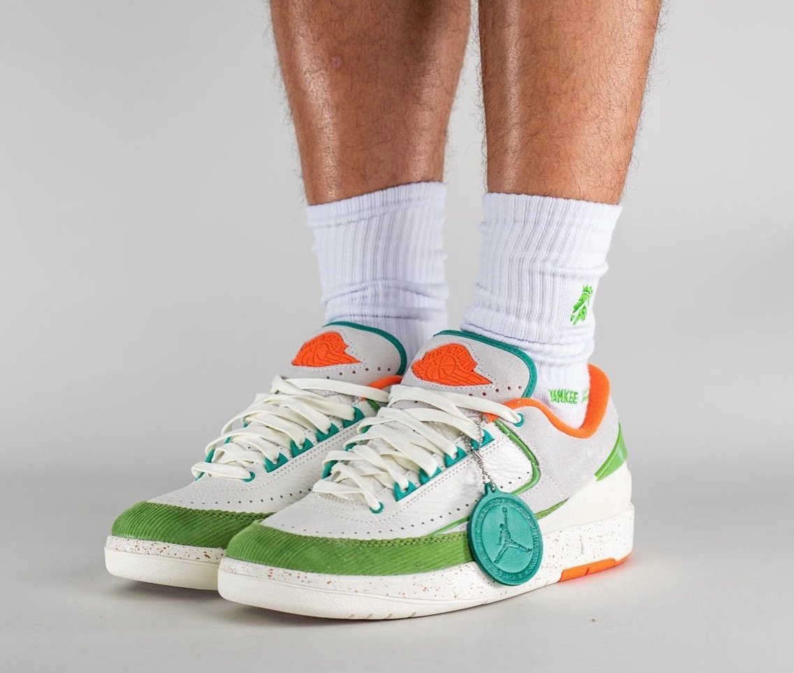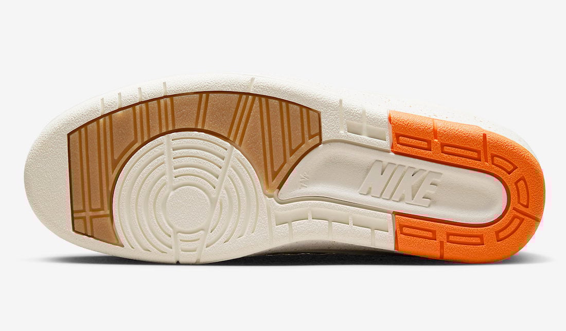This low-top Air Jordan 2 comes dressed in a Sail, Safety Orange, Chlorophyll, and Coconut Milk color combination. Across the upper, we have a leather Sail with a tumbled finish, and Grey suede drapes the overlays. Next, Chlorophyll Green corduroy wraps the toe box and expands to the sides, and Orange adorns the liner and Jumpman on the tongue. We also have Teal eyelets and on the very top of the tongue. Other details include speckled detailing runs across the midsole, Titan branding on the hangtag, and special Titan graphics on the insoles.